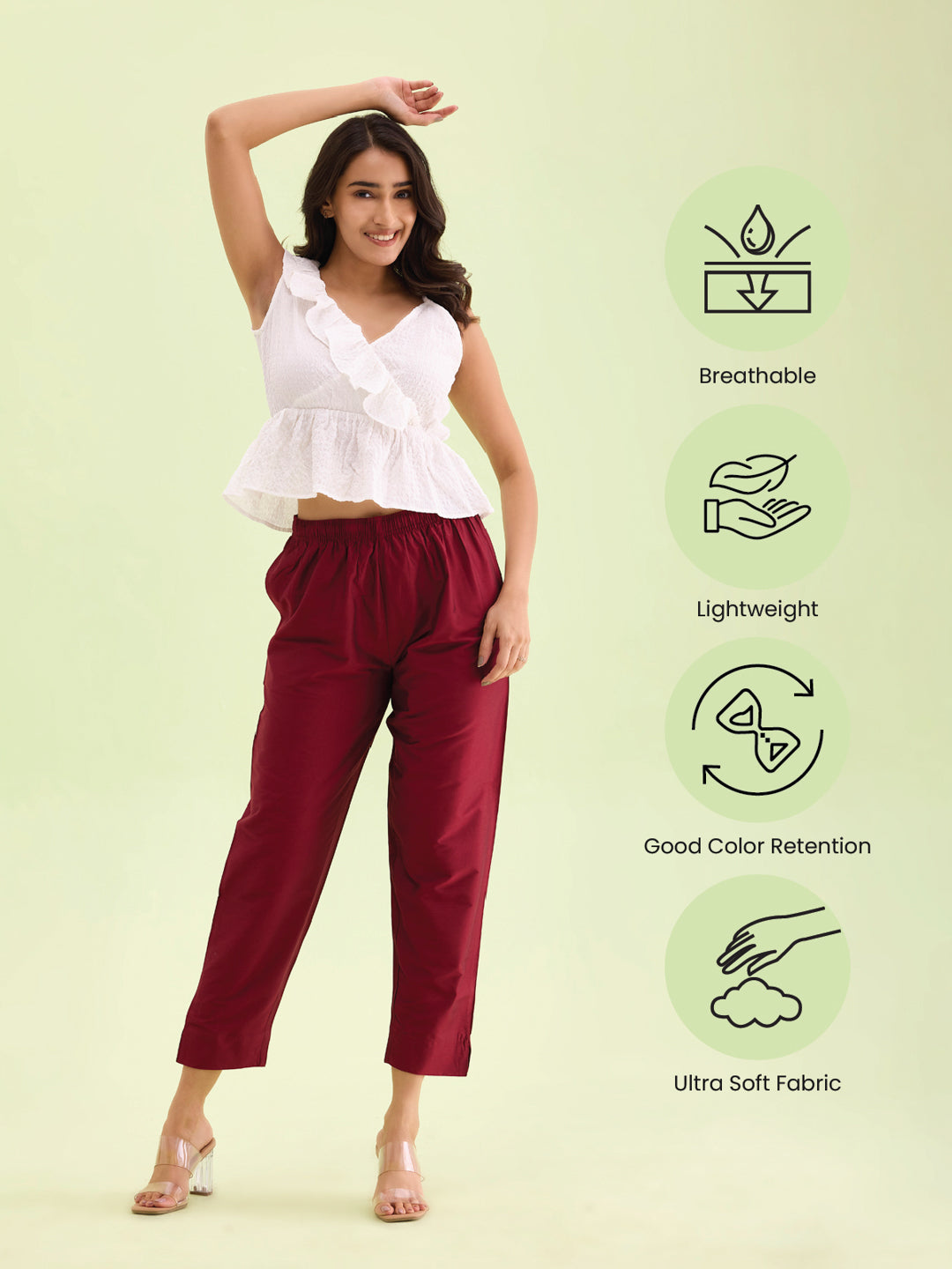 Go from ethnic to western look in a jiffy with the Solid Maroon Metallic Pants. Made from polyester & modal, it has a elasticised waistband, a slant pocket, tapered fit with slit at the hem.