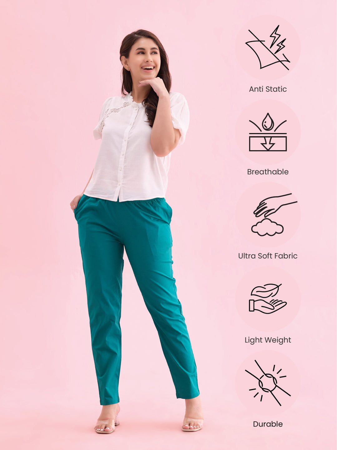 Go from casual to street smart look in a jiffy with the Solid Peacock Green Cotton Pants. Made from cotton, it has a elasticised waistband with drawstring closure, slant pockets, mid rise & a tapered fit.