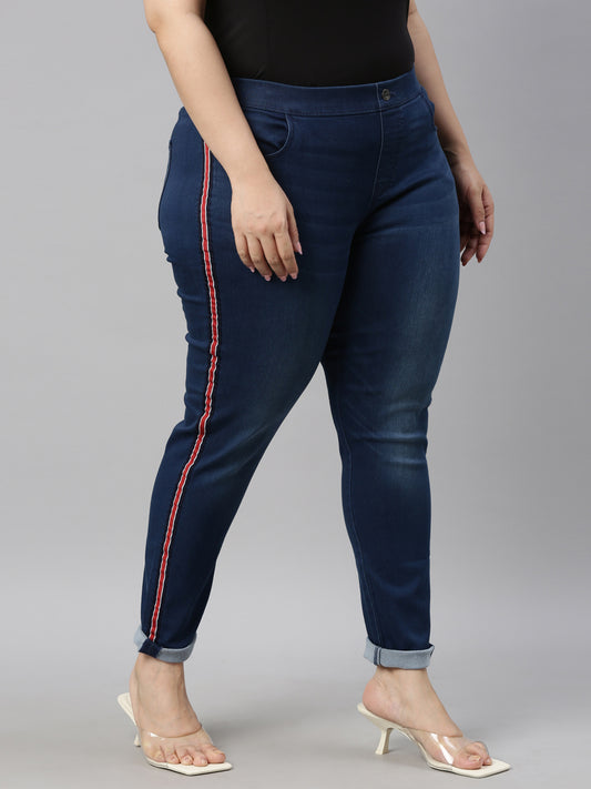 Blue Cotton Poly Stretch Side Stripe Denim Jeggings