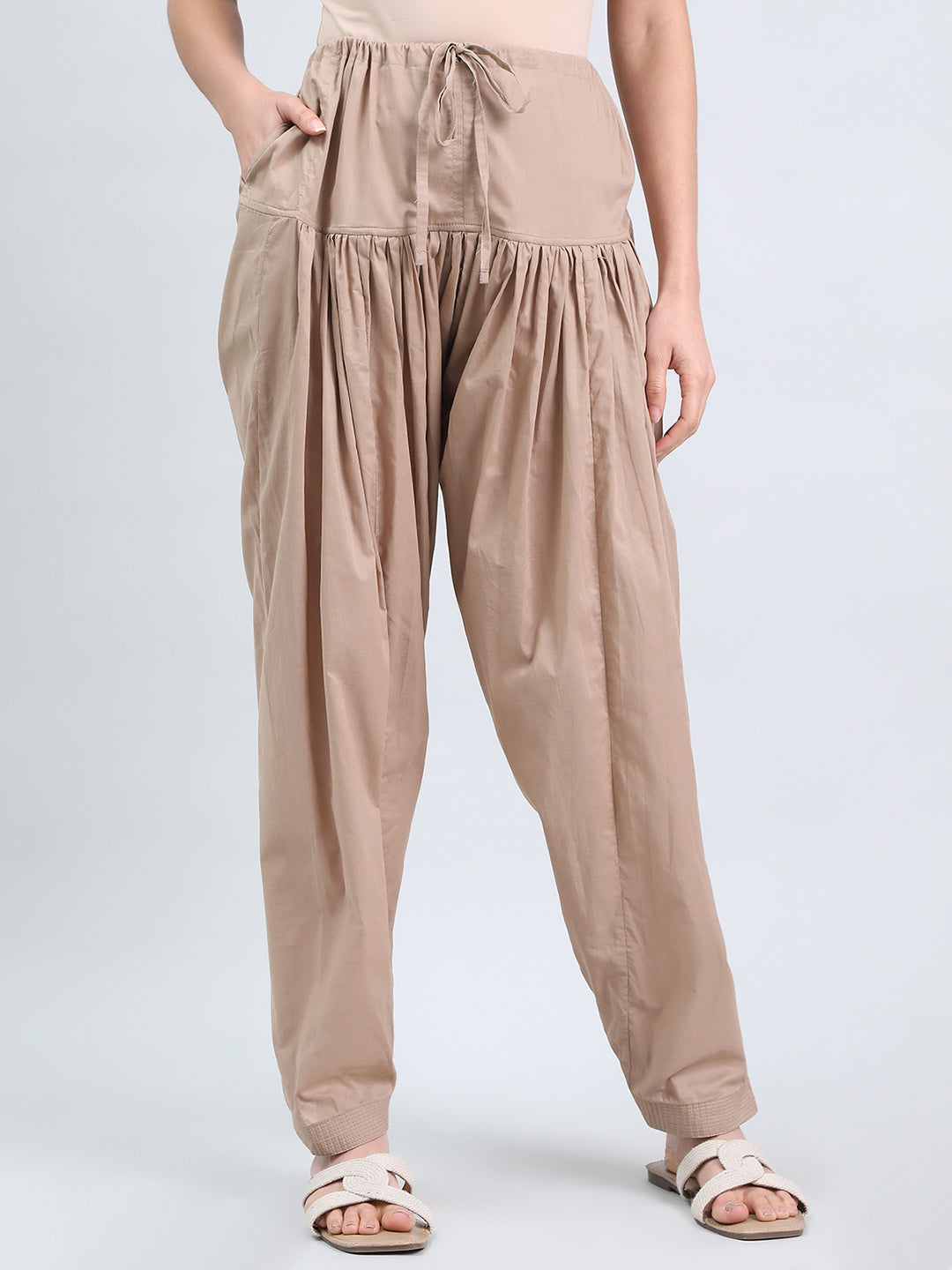 Spruce up a look or spend the day comfortably in the Beige Cotton Salwar. It has a drawstring pull-up closure, front pleats with a regular fit. Can pair it with a tunic or any kurti for a fun everyday look