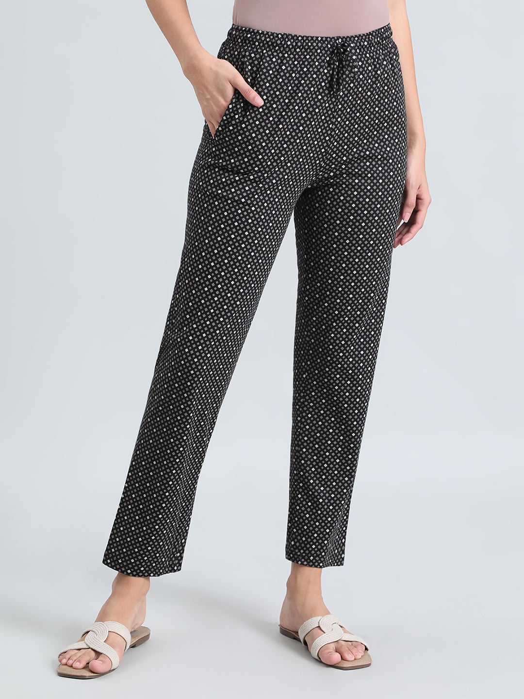 Look chic while lounging in our Printed Cotton Lounge Pants. Made from cotton, it has a elasticised waistband with drawstring closure, slant pockets & is extremely light weight