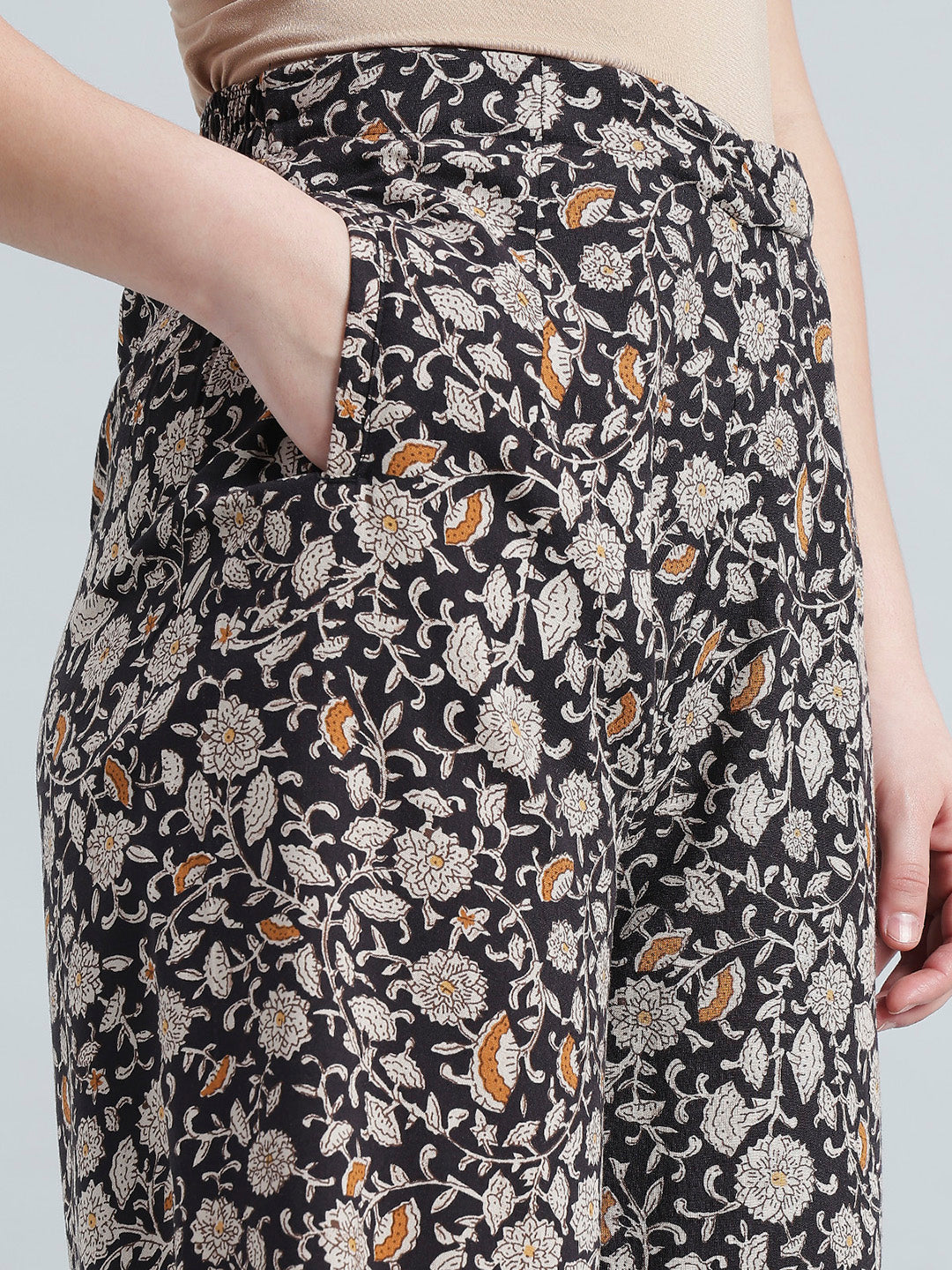 Go from meetings to a club in a jiffy in a pair of Black Mid Rise Printed Palazzos paired with a button up shirt. Made from viscose, it is has a wide leg silhoutte & is a mid-rise palazzo with elasticised waistband & a side slant pocket .