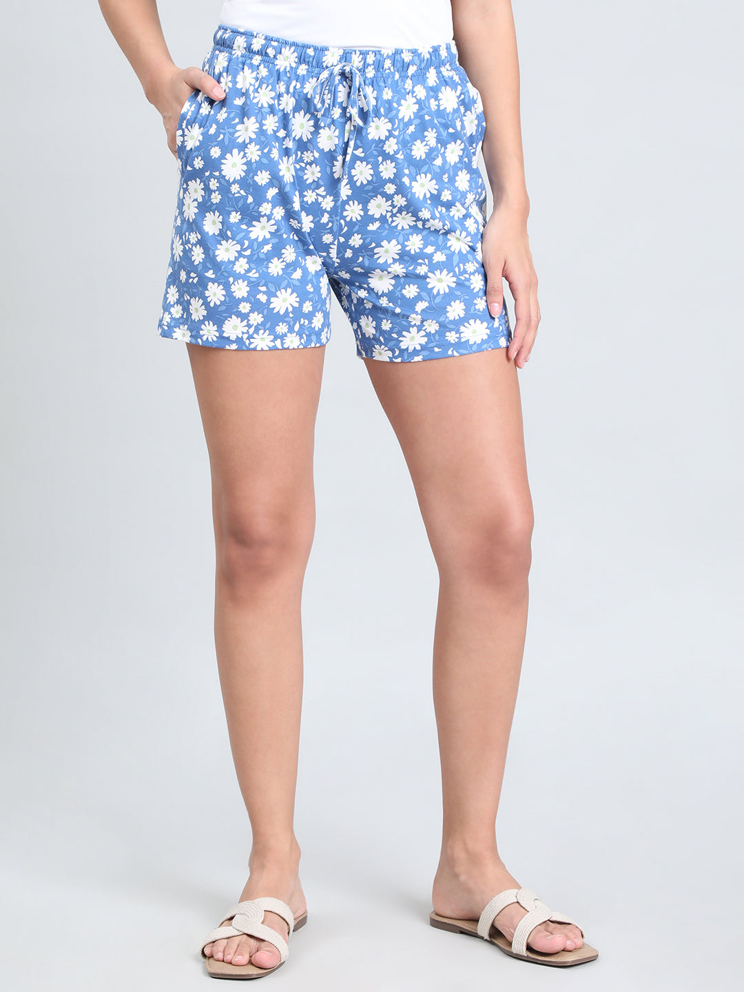 Look chic while lounging in our Blue Printed Knit Lounge Shorts. Made from cotton, it has a elasticised waistband with drawstring closure, slant pockets & is extremely light weight