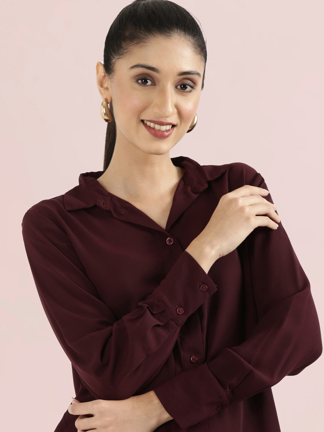 A long crepe shirt designed with a classic collar and fluid fabric that drapes beautifully. The relaxed silhouette offers comfort while maintaining a polished look. Crafted from soft crepe fabric composed of 100% polyester that offers smooth texture and graceful drape. Style it with Go Colors trousers or wide jeans for a versatile outfit that works for office days, casual outings and easy everyday dressing.