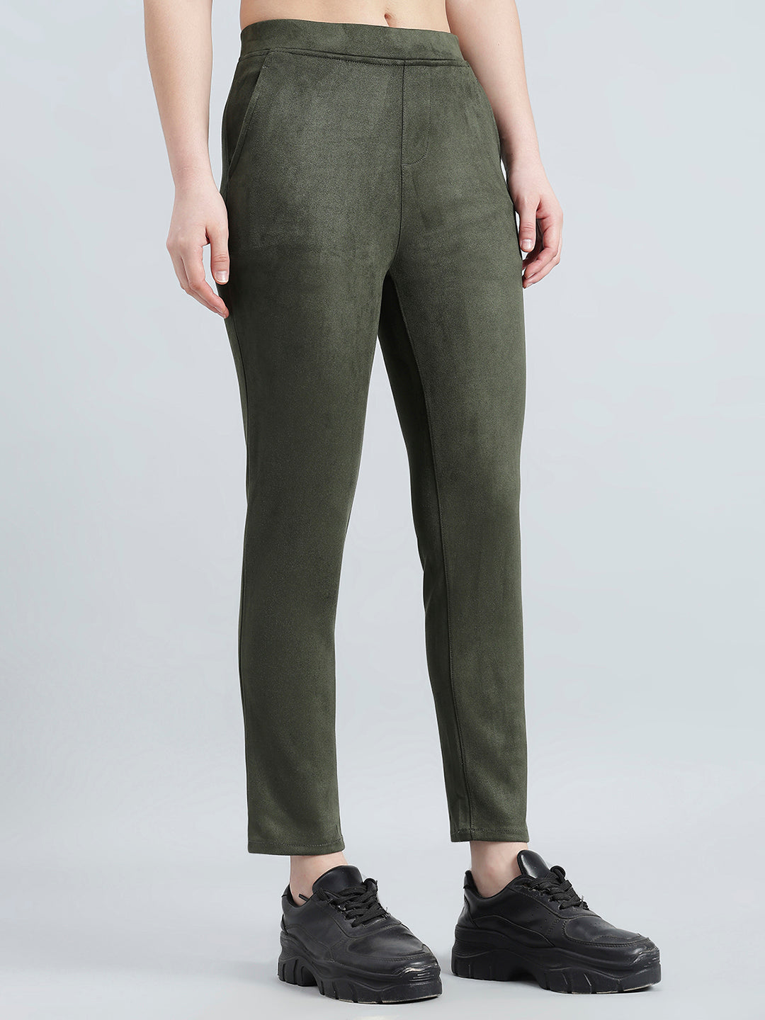 Stay warm this winter in the Solid Dark Olive Mid Rise Suede Treggings. Made from polyester & elastane, this mid rise slip on trousers with elasticised waistband & slim fit are perfect for board meetings or night out in the town