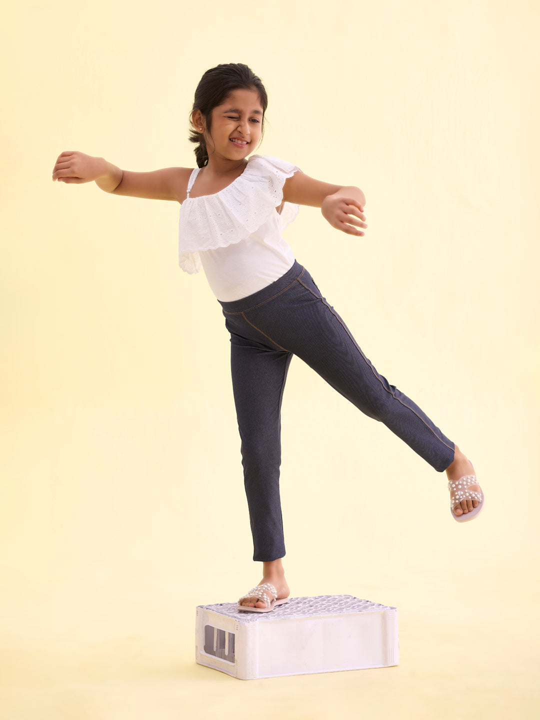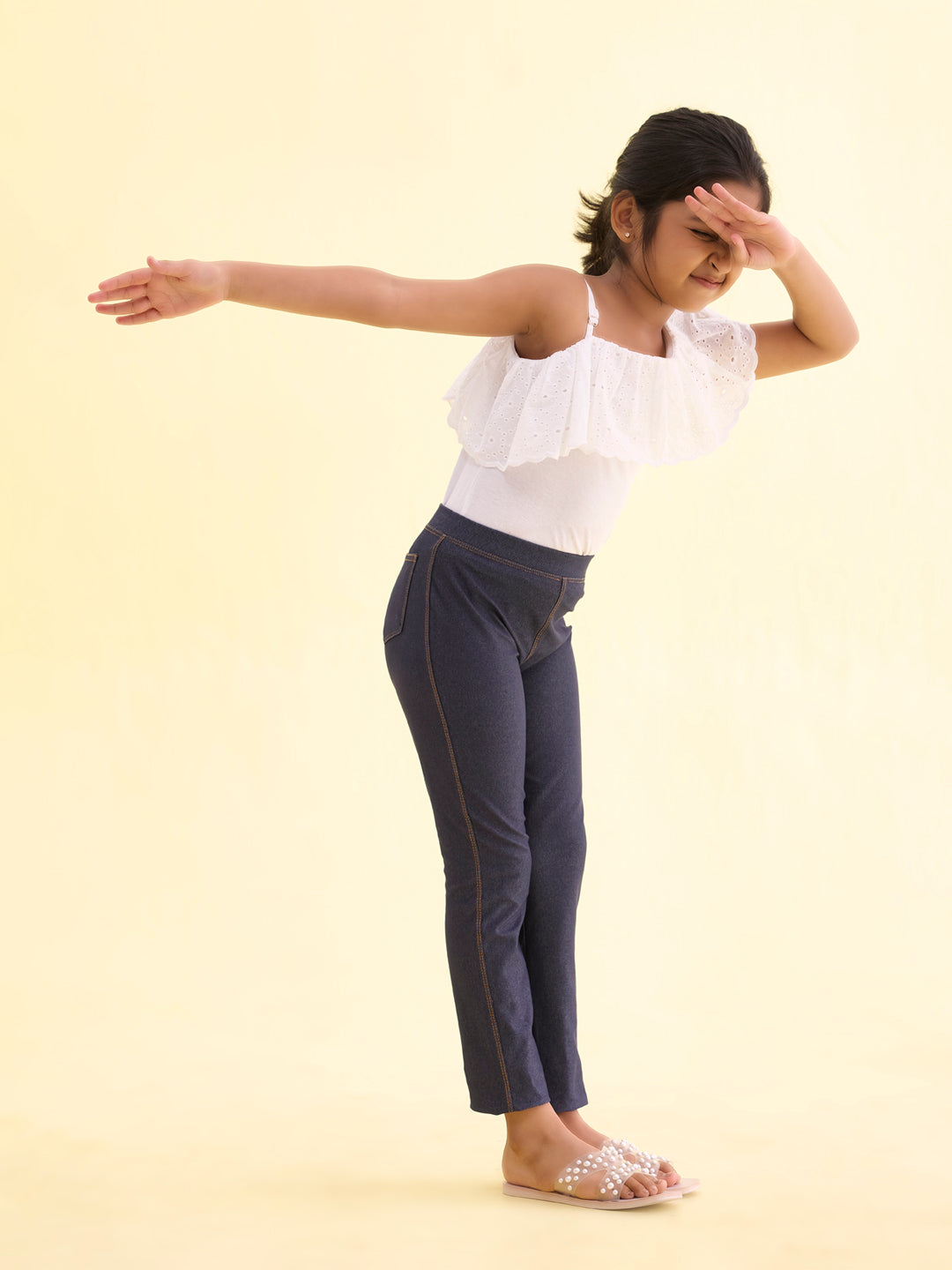 Up your fashion game effortlessly with the Solid Blue Slip On Knit Jeggings. Made from Cotton, Polyester & Spandex, this pair of slip on jeggings have a elasticised waistband, patch pockets at the back & a slim fit.