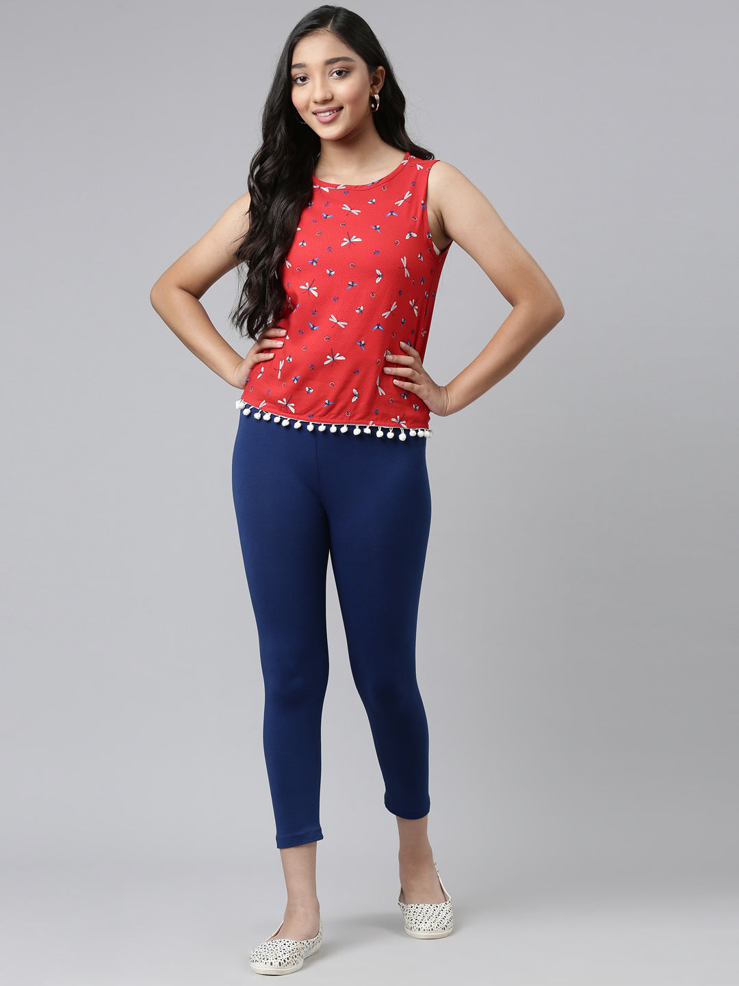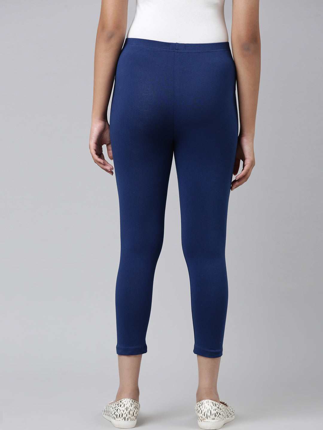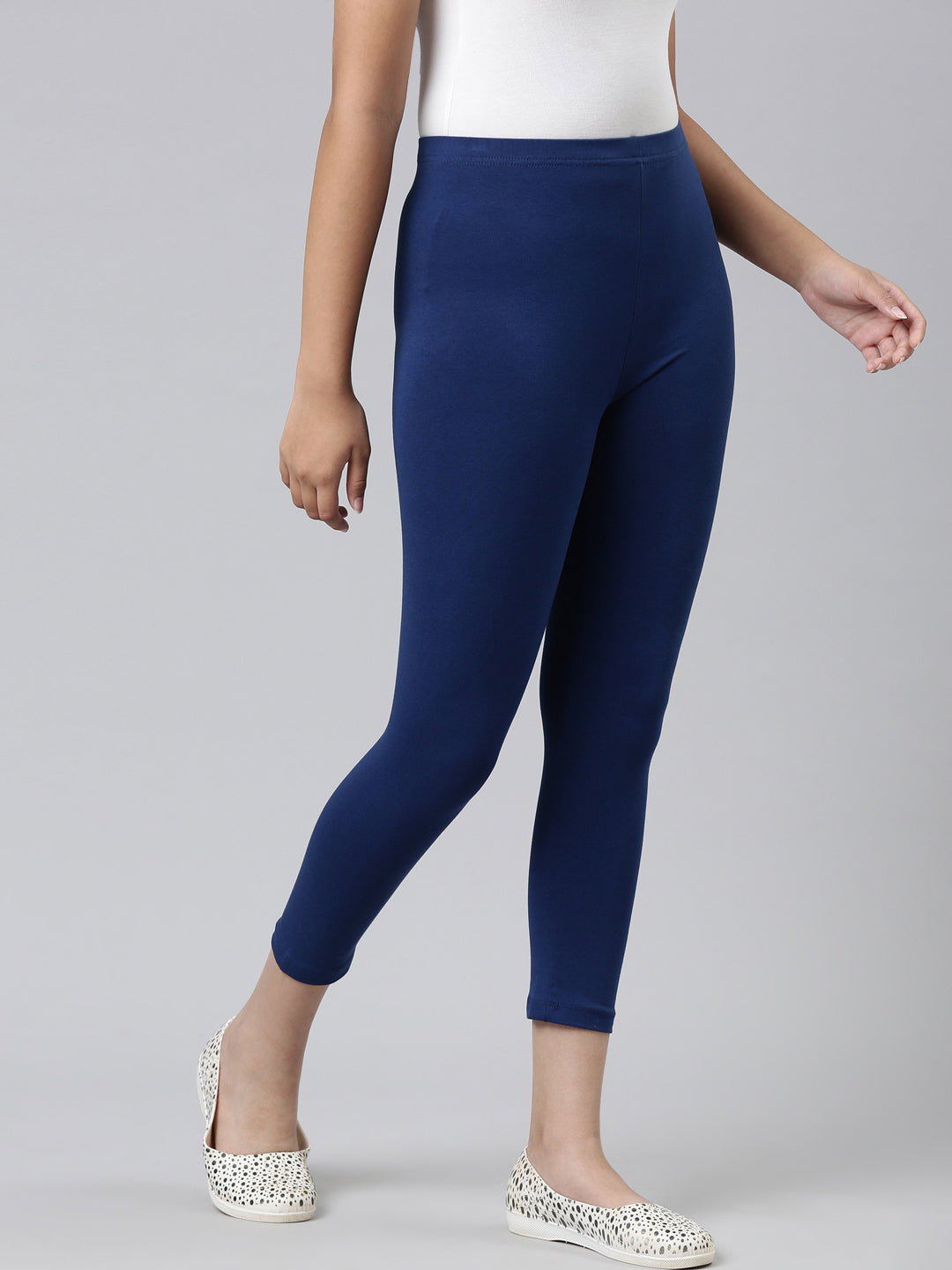 Be it any situation, the Solid Light Ink Blue Three- Fourth Leggings are perfect. Made from, it has a elasticised waistband, slim fit & is of calf length.