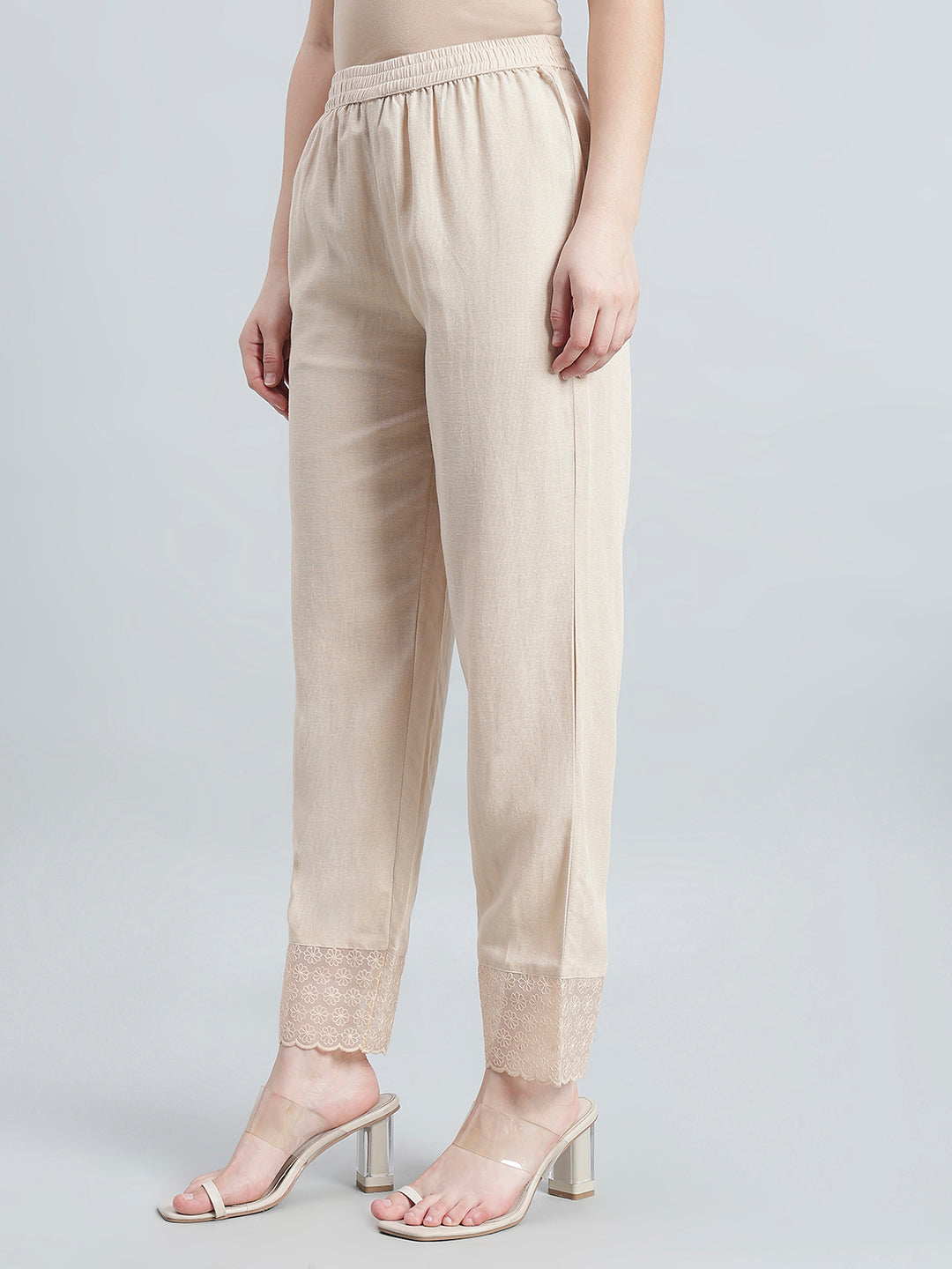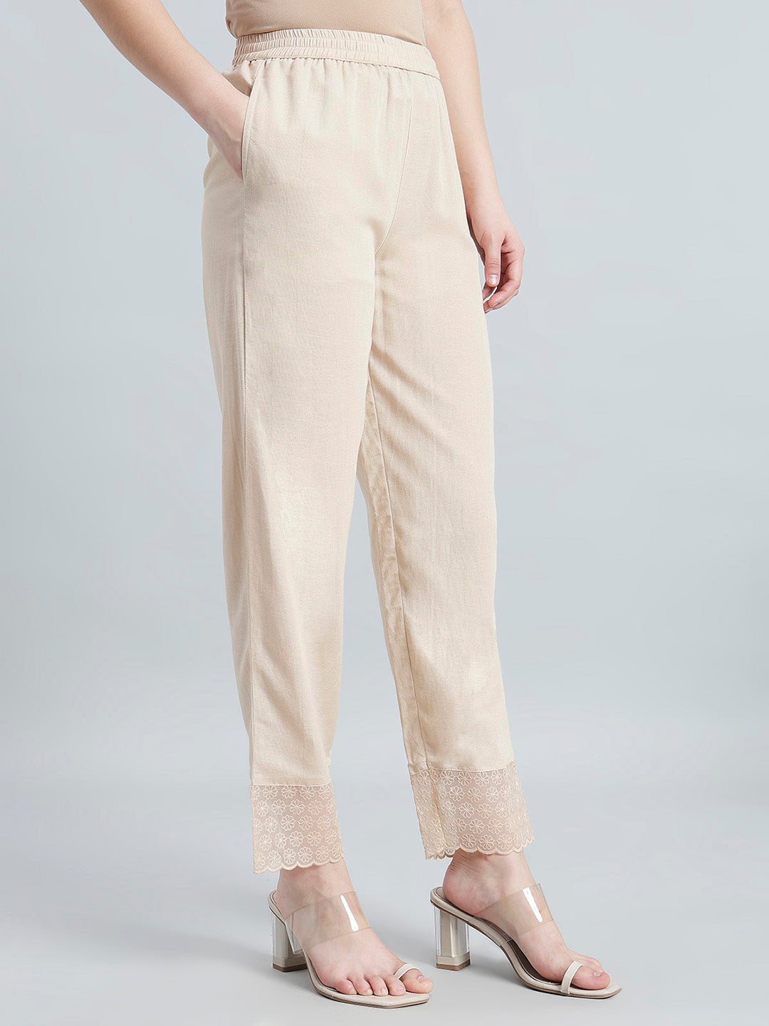 Step into effortless elegance with these Light Beige Ethnic Organza Pants, crafted from a blend of 55% Rayon and 35% Cotton for breathable comfort with a refined finish. Designed in a solid woven fabric, these pants offer a relaxed fit that ensures ease of movement while maintaining a polished silhouette. The flattering mid-rise waist and full-length with a side pocket. An elasticated waistband provides a comfortable and secure fit, perfect for all-day wear. Intricate embroidery detailing at the bottom hem.