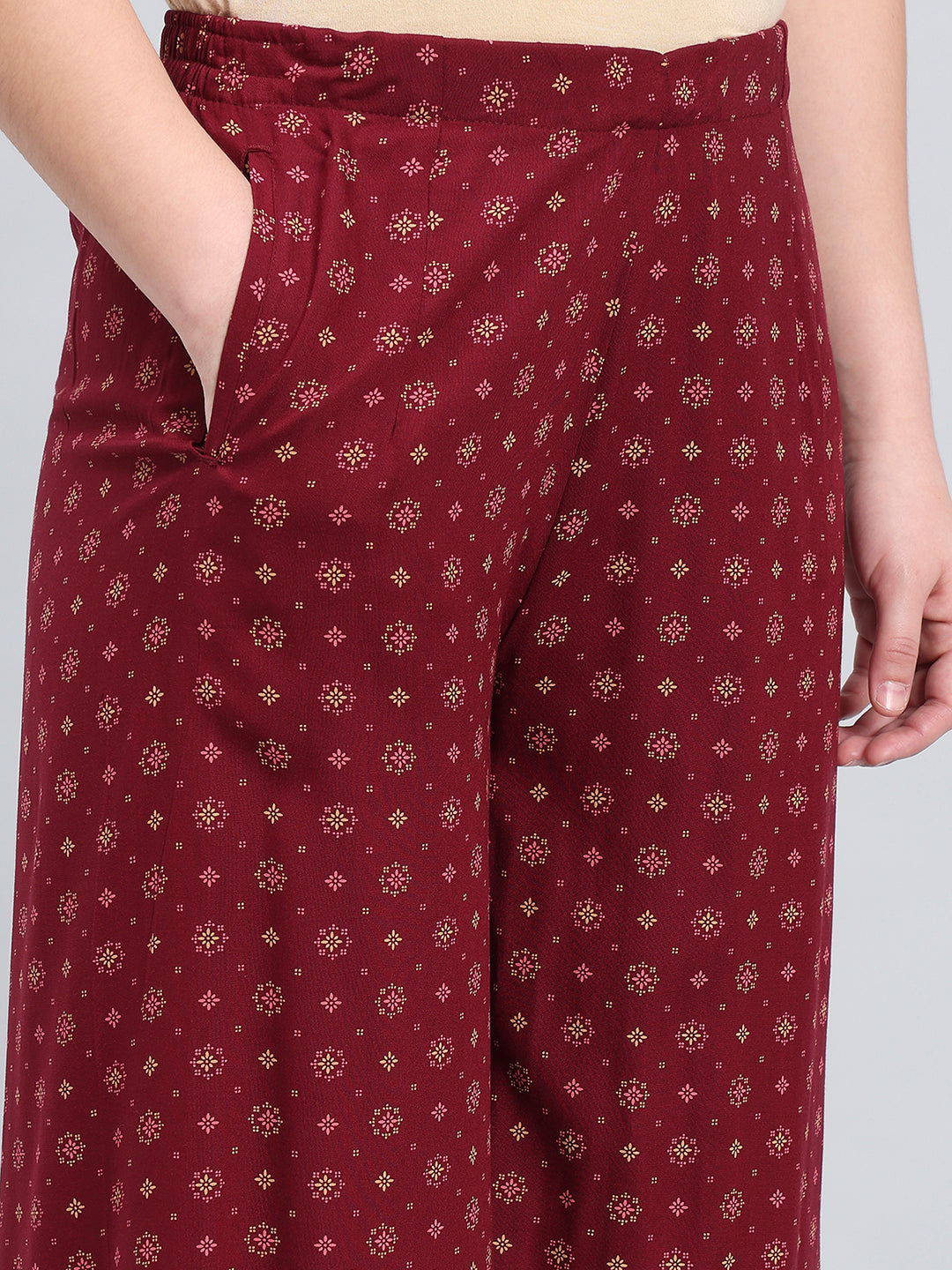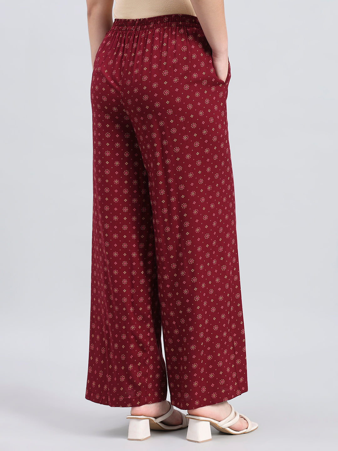 Go from meetings to a club in a jiffy in a pair of Maroon Mid Rise Printed Palazzos paired with a button up shirt. Made from viscose, it is has a wide leg silhoutte & is a mid-rise palazzo with elasticised waistband & a side slant pocket .