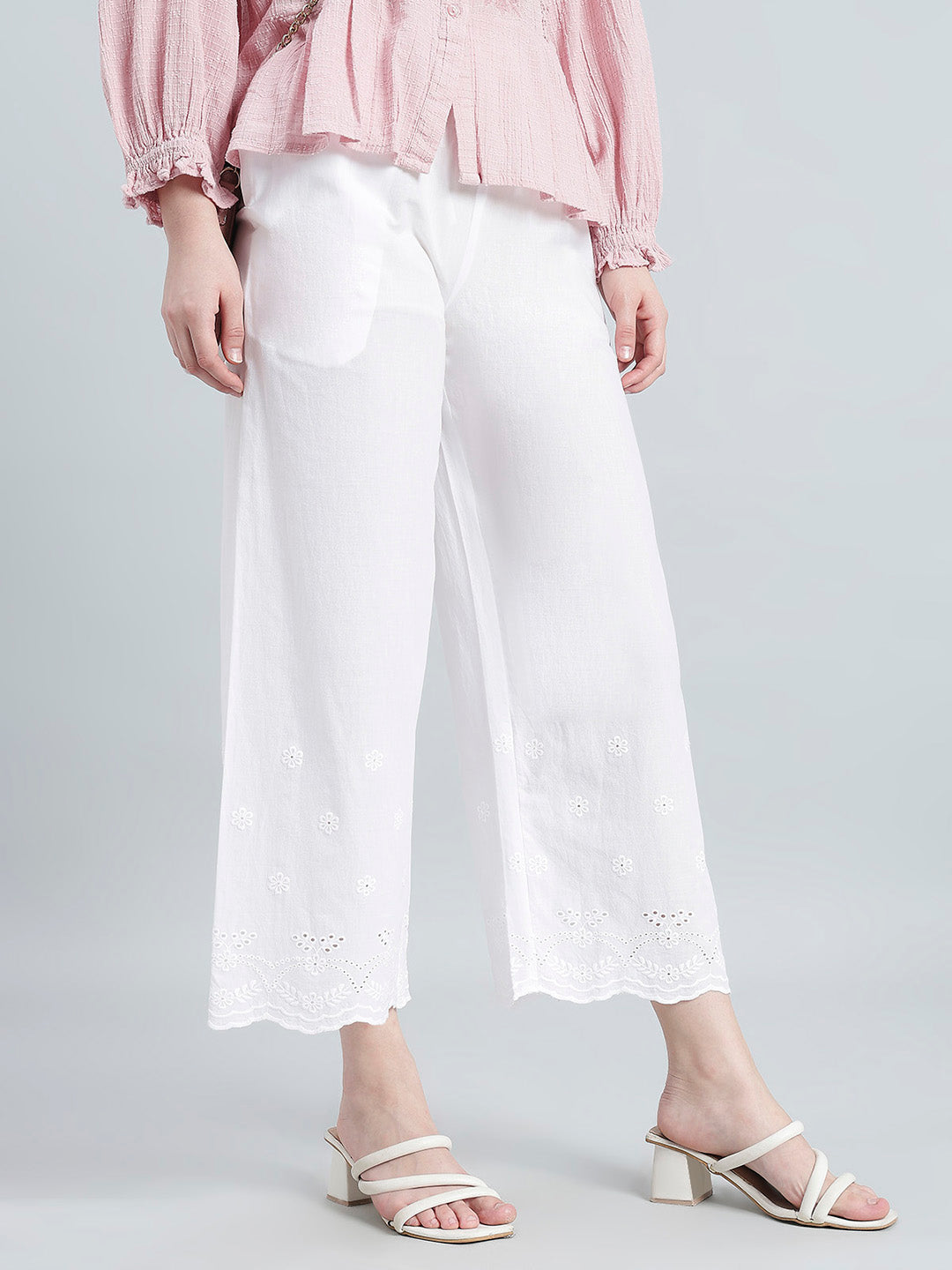 Crafted from breathable cotton, our White Hakoba Wide Pant offers a relaxed fit with a mid-rise waist featuring adjustable inner drawstrings and ankle-length cut. Detailed with Floral embroidery at the hem and a side pocket, it blends everyday comfort with effortless ethnic elegance.