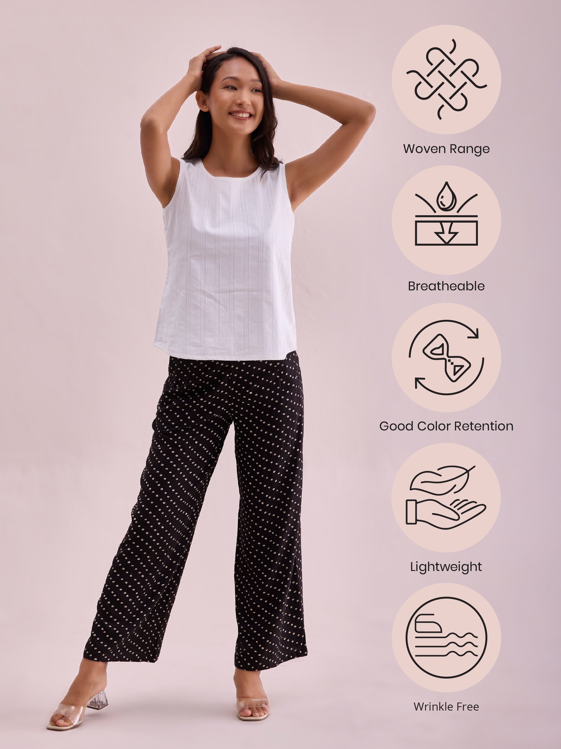 Go from meetings to a club in a jiffy in a pair of Black Mid Rise Printed Palazzos paired with a button up shirt. Made from viscose, it is has a wide leg silhoutte & is a mid-rise palazzo with elasticised waistband & a side slant pocket.
