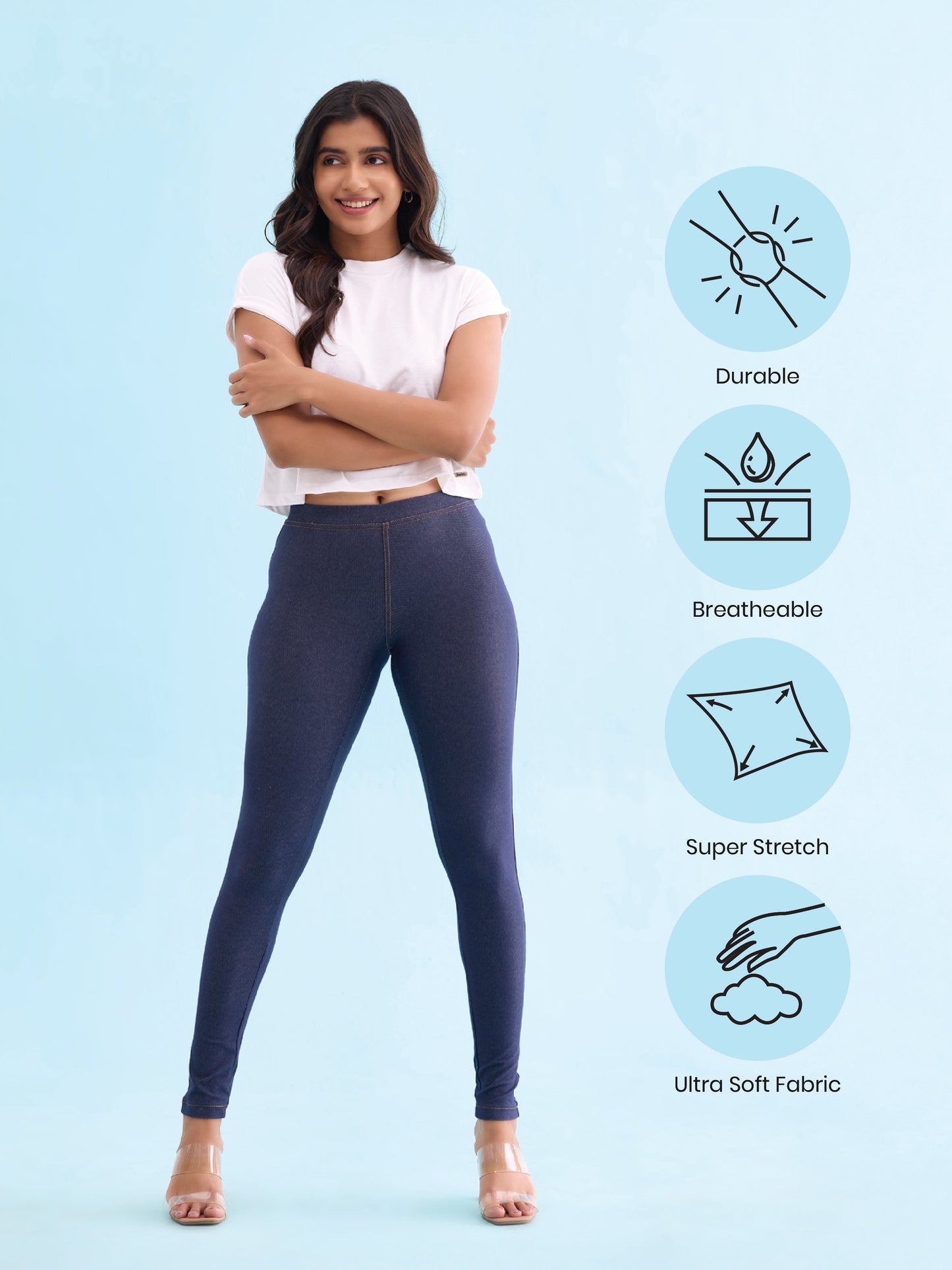 Up your fashion game effortlessly with the Blue Jeg Slip On Knit Jeggings. Made from cotton & elastane, this pair of slip on jeggings have a elasticised waistband, patch pockets at the back & a slim fit.