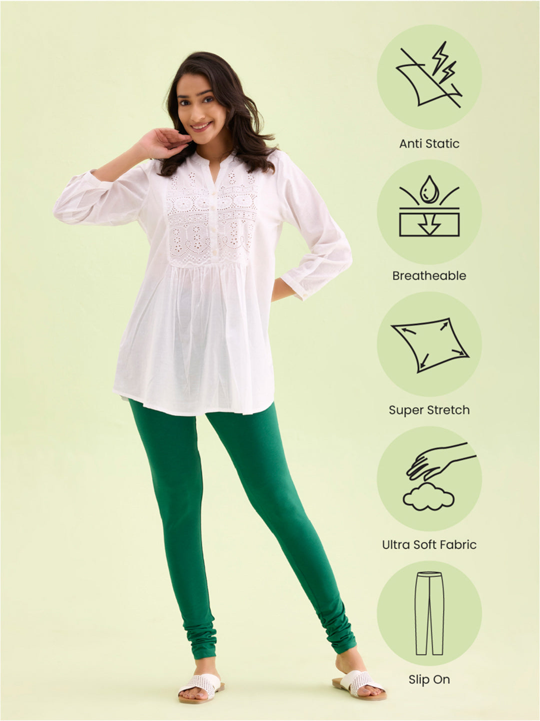 Go chic with a pair of Bottle Green Solid Churidar Leggings. Made from high quality cotton, it has a elasticised waistband & gathers at the hemline.