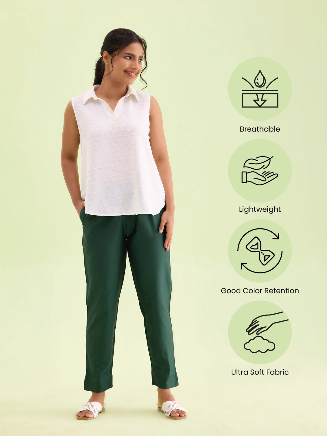 Go from ethnic to western look in a jiffy with the Solid Bottle Green Metallic Pants. Made from poleyster & modal, it has a elasticised waistband, a slant pocket, tapered fit with slit at the hem.