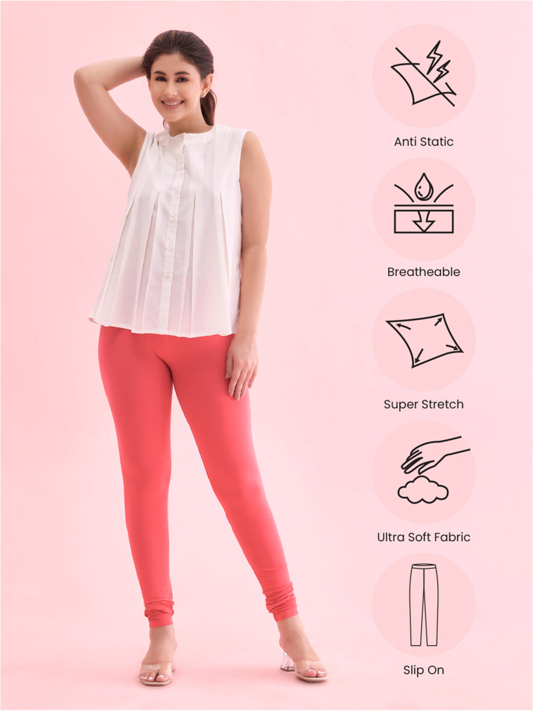 Go chic with a pair of Coral Solid Churidar Leggings. Made from high quality cotton, it has a elasticised waistband & gathers at the hemline.
