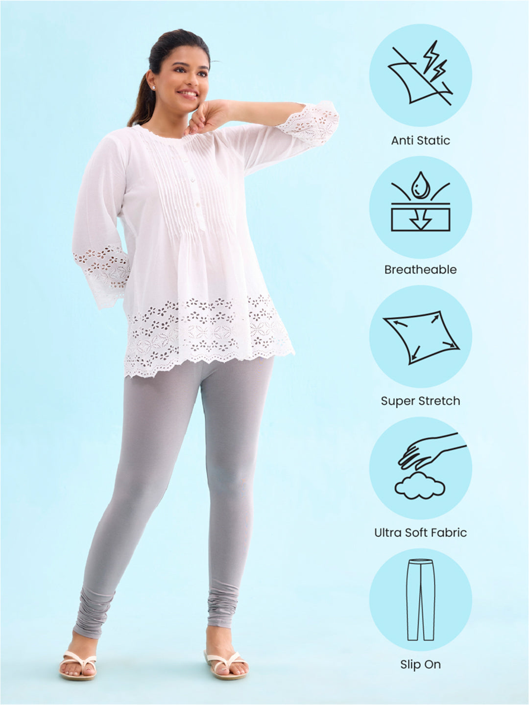 Go chic with a pair of Ebony Grey Solid Churidar Leggings. Made from high quality cotton, it has a elasticised waistband & gathers at the hemline.