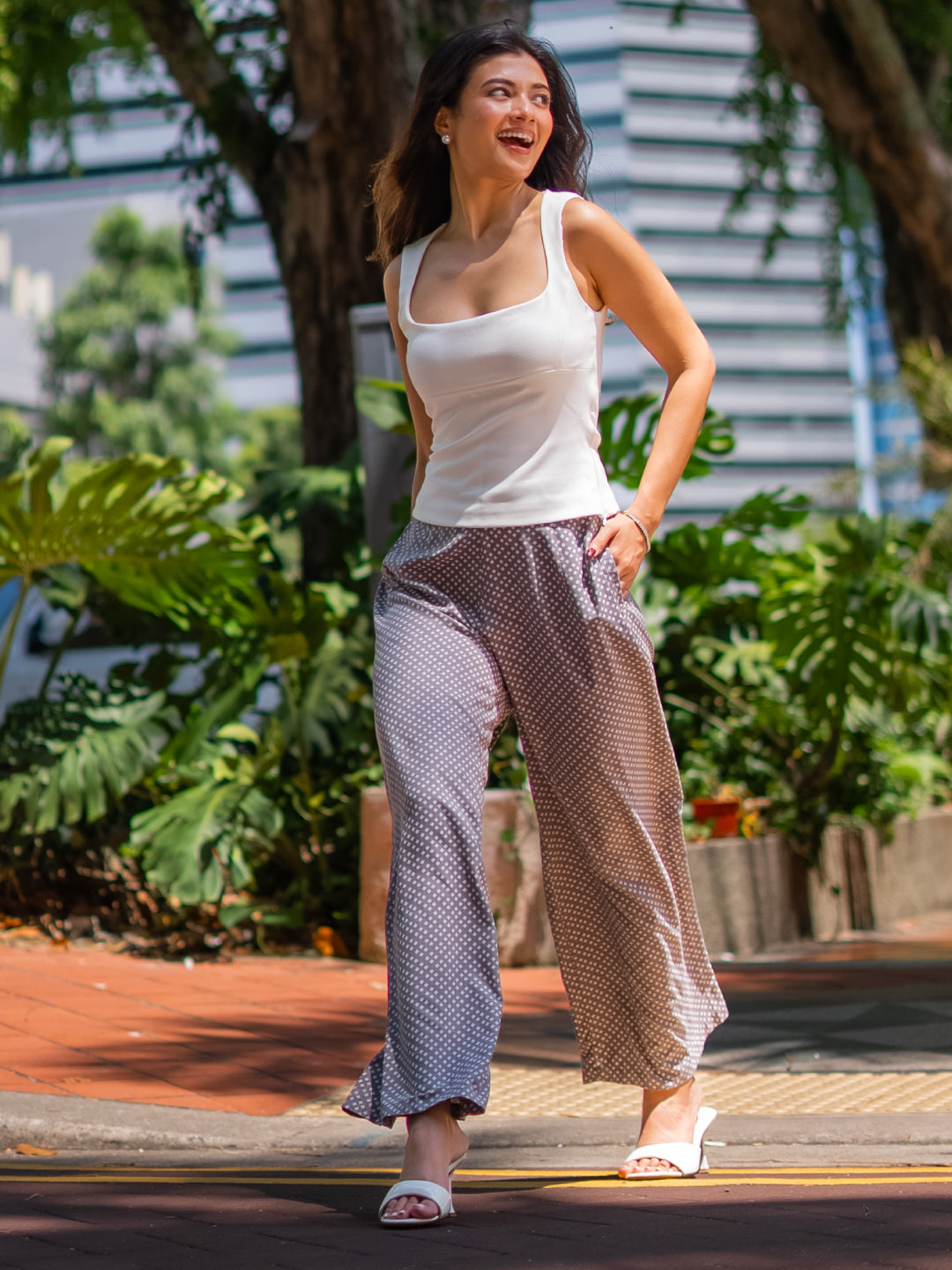 Go from meetings to a club in a jiffy in a pair of Grey Mid Rise Printed Palazzos paired with a button up shirt. Made from viscose, it is has a wide leg silhoutte & is a mid-rise palazzo with elasticised waistband & a side slant pocket.