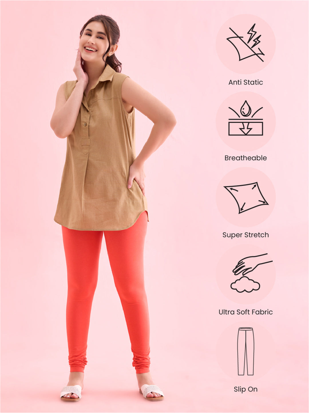 Go chic with a pair of Medium Coral Solid Churidar Leggings. Made from high quality cotton, it has a elasticised waistband & gathers at the hemline.