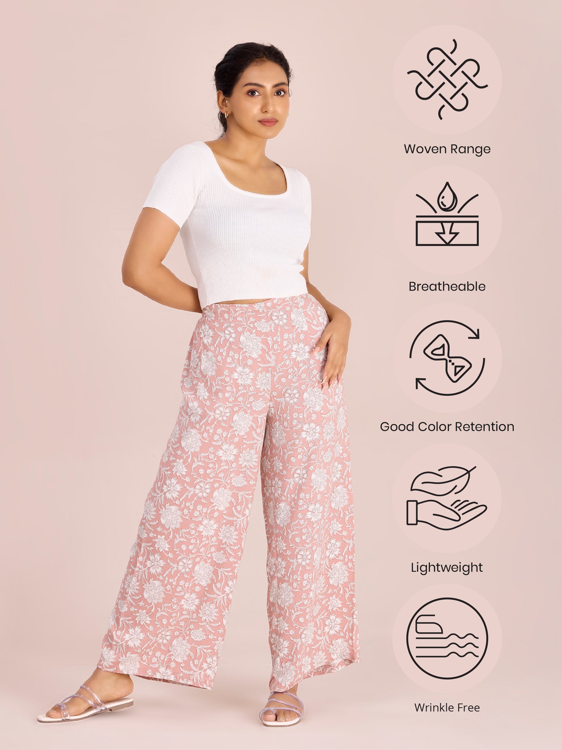 Go from meetings to a club in a jiffy in a pair of Medium Pink Mid Rise Printed Palazzos paired with a button up shirt. Made from viscose, it is has a wide leg silhoutte & is a mid-rise palazzo with elasticised waistband & a side slant pocket.