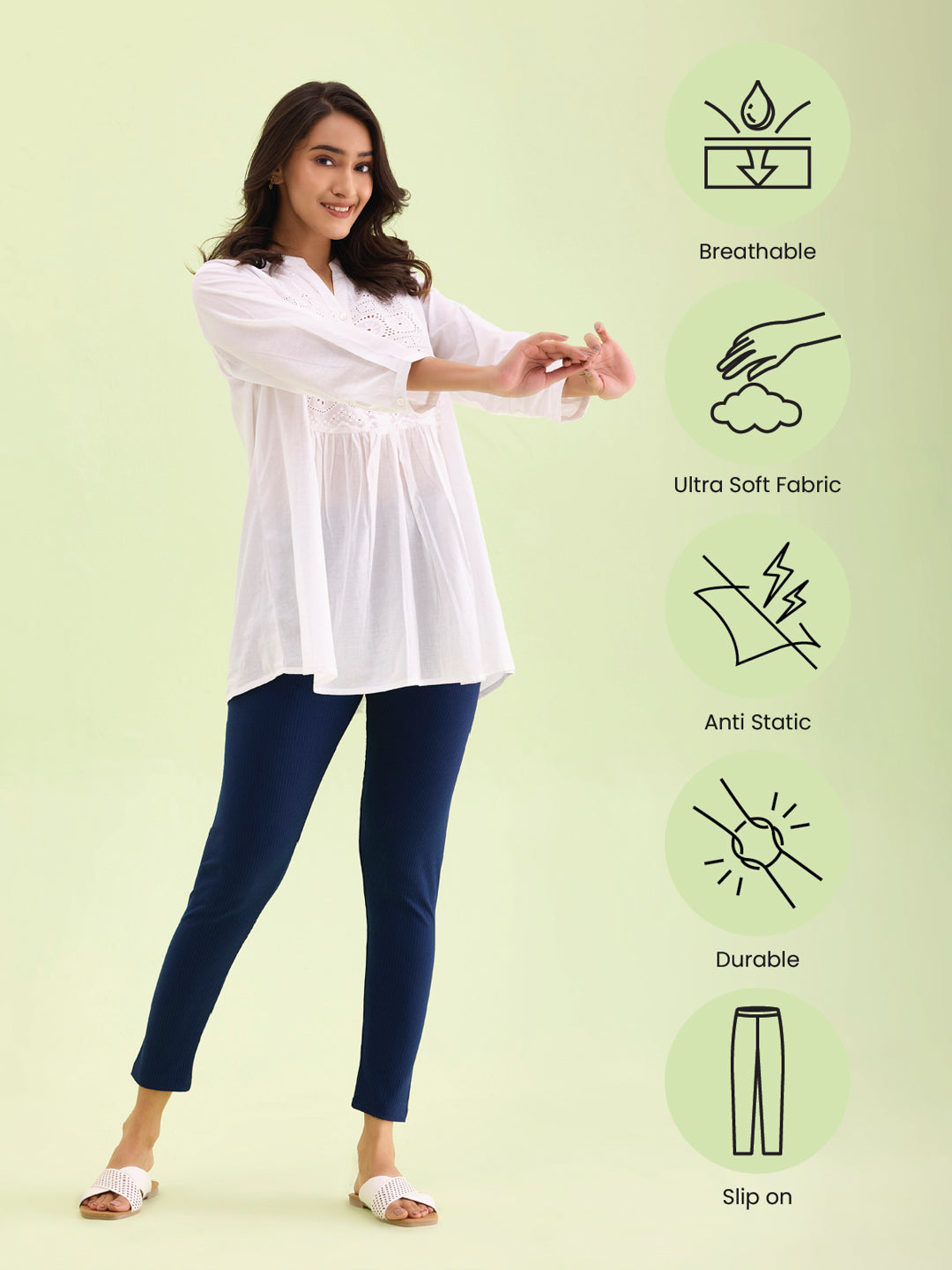 Go the ethnic way with our Solid Navy Ribbed Leggings. Made from Rayon & Spandex it has a elasticised waistband, slim fit & is of ankle length