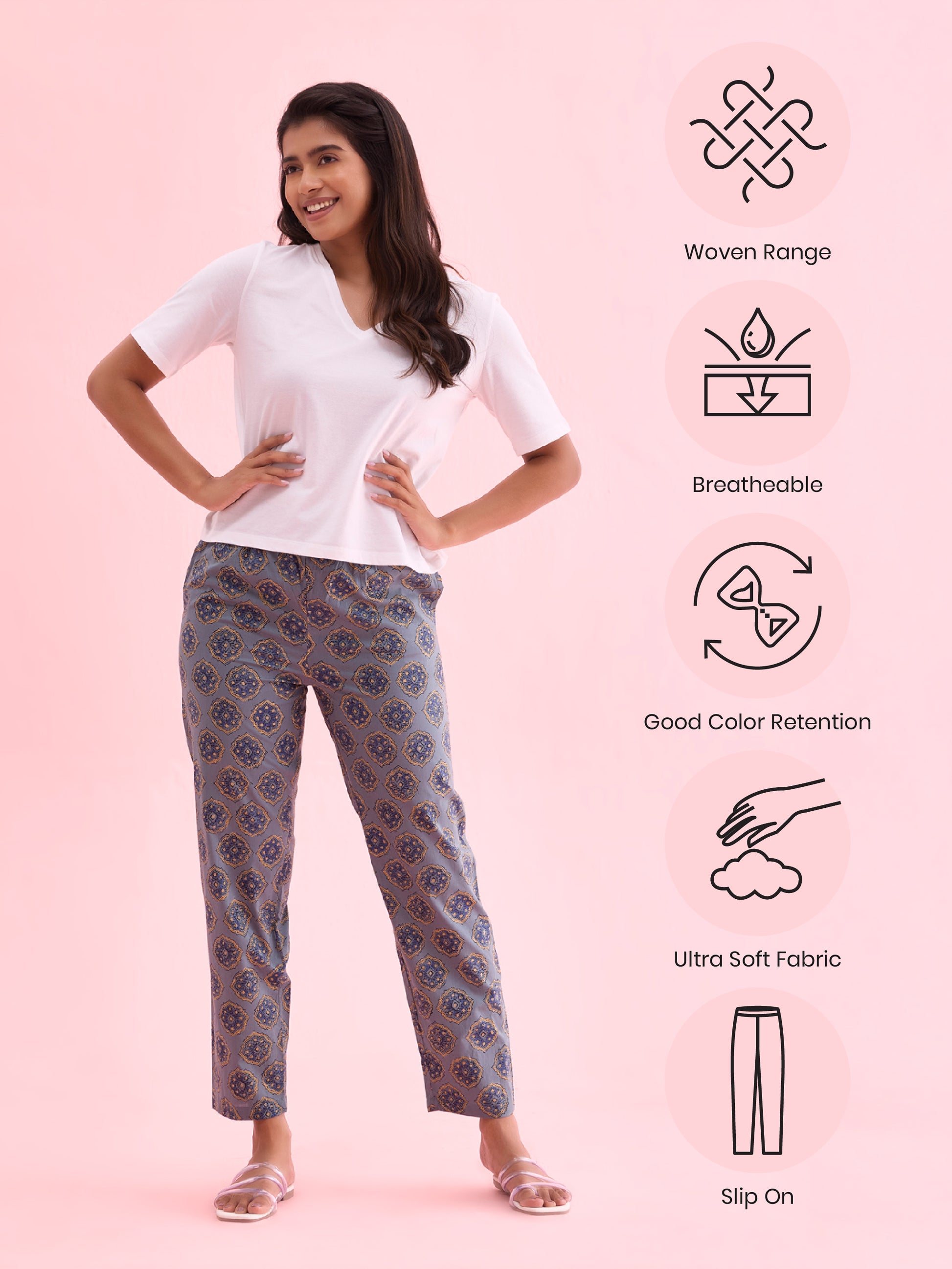 Look chic while lounging in our Printed Cotton Lounge Pants. Made from cotton, it has a elasticised waistband with drawstring closure, slant pockets & is extremely light weight.