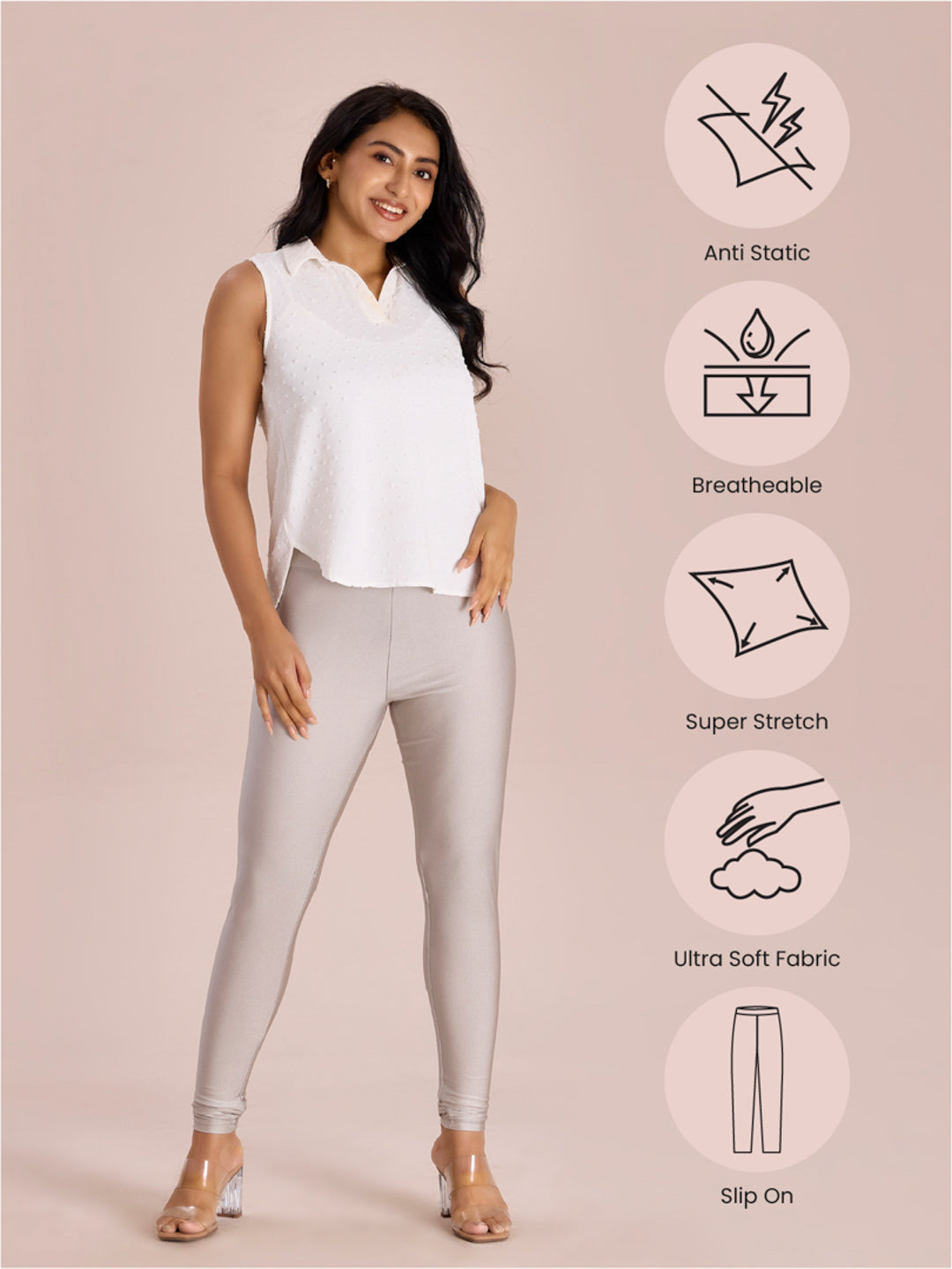 Go chic with a pair of Silver Solid Shimmer Churidar Leggings. Made from high quality Nylon & Elastane, it has a elasticised waistband & gathers at the hemline.