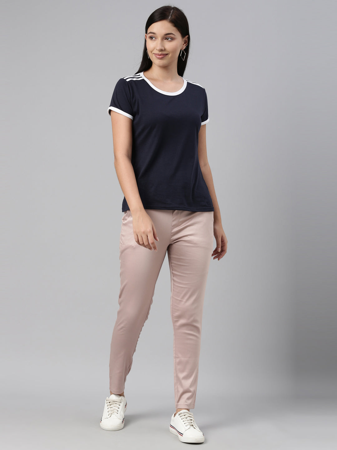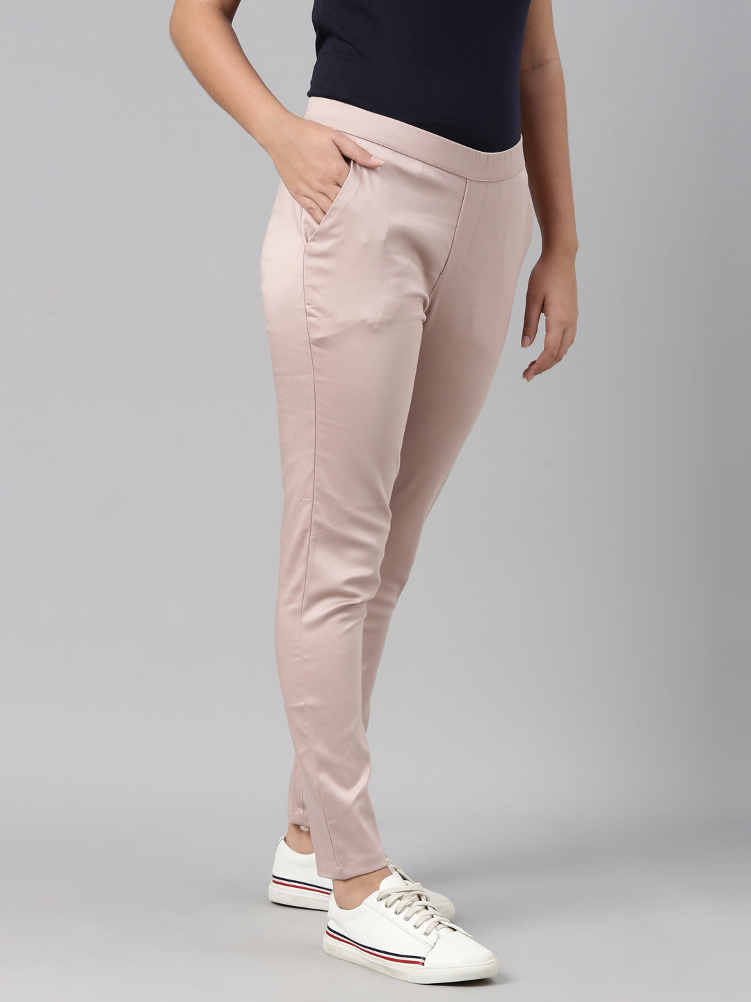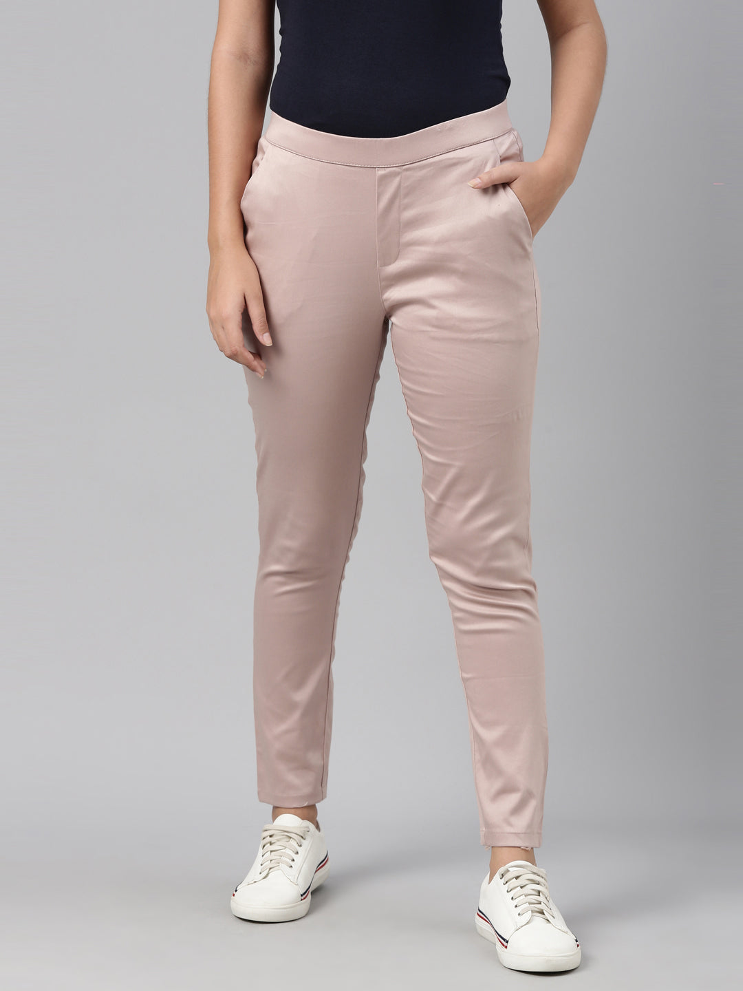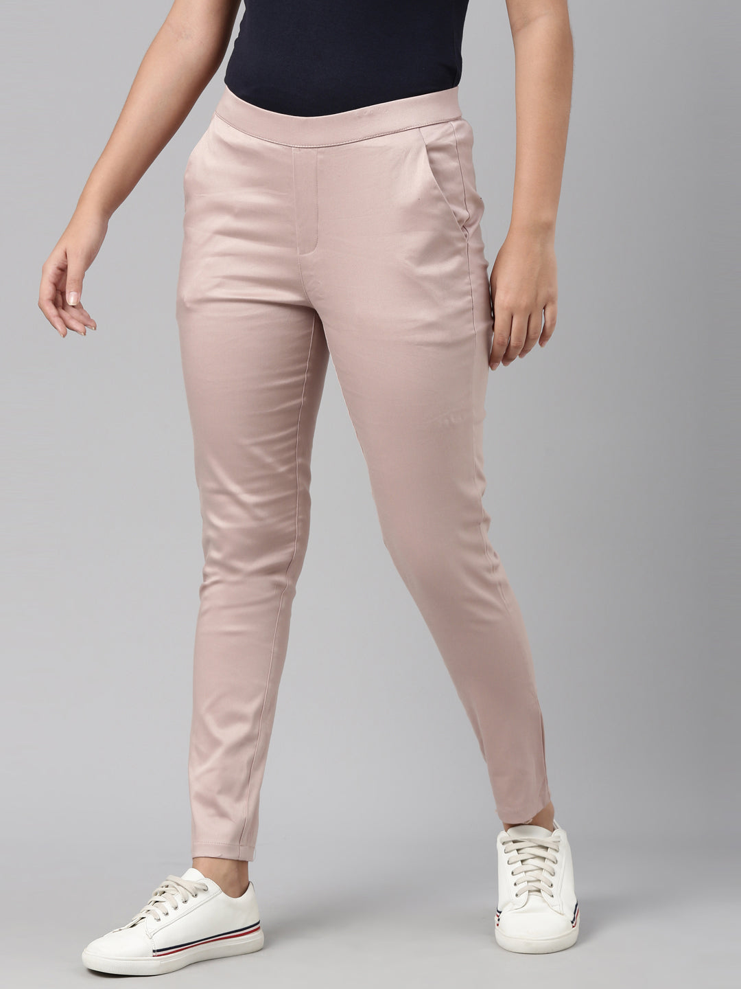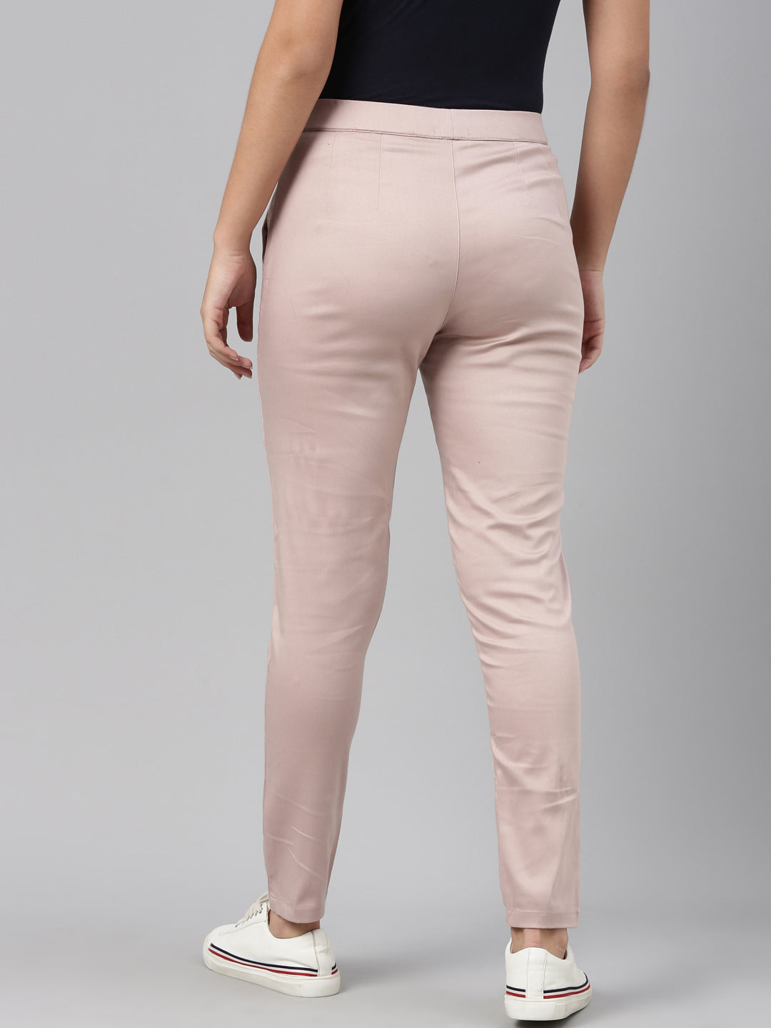Bring a twist to your everyday work wear with the Solid Baby Pink Mid Rise Treggings. Made from cotton, it has a elasticised waistband, slant pockets & is of a slim fit.