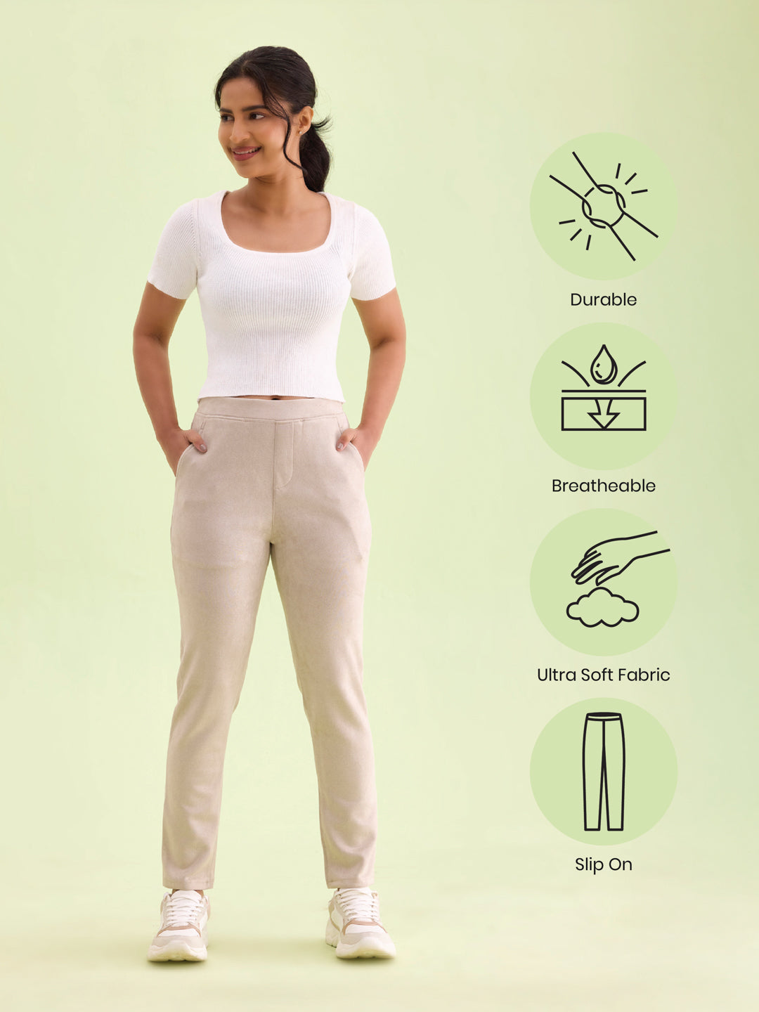 Stay warm this winter in the Solid Beige Mid Rise Suede Treggings. Made from polyester & elastane, this mid rise slip on trousers with elasticised waistband & slim fit are perfect for board meetings or night out in the town.