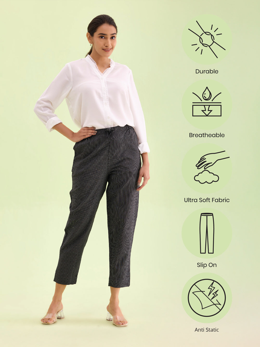 Go from board room to a brunch meeting in a snap with the Striped Black Linen Pencil Pants. Made from cotton & elastane, it has a elasticised waistband with a concealed zipper, patch pockets & a tapered fit.
