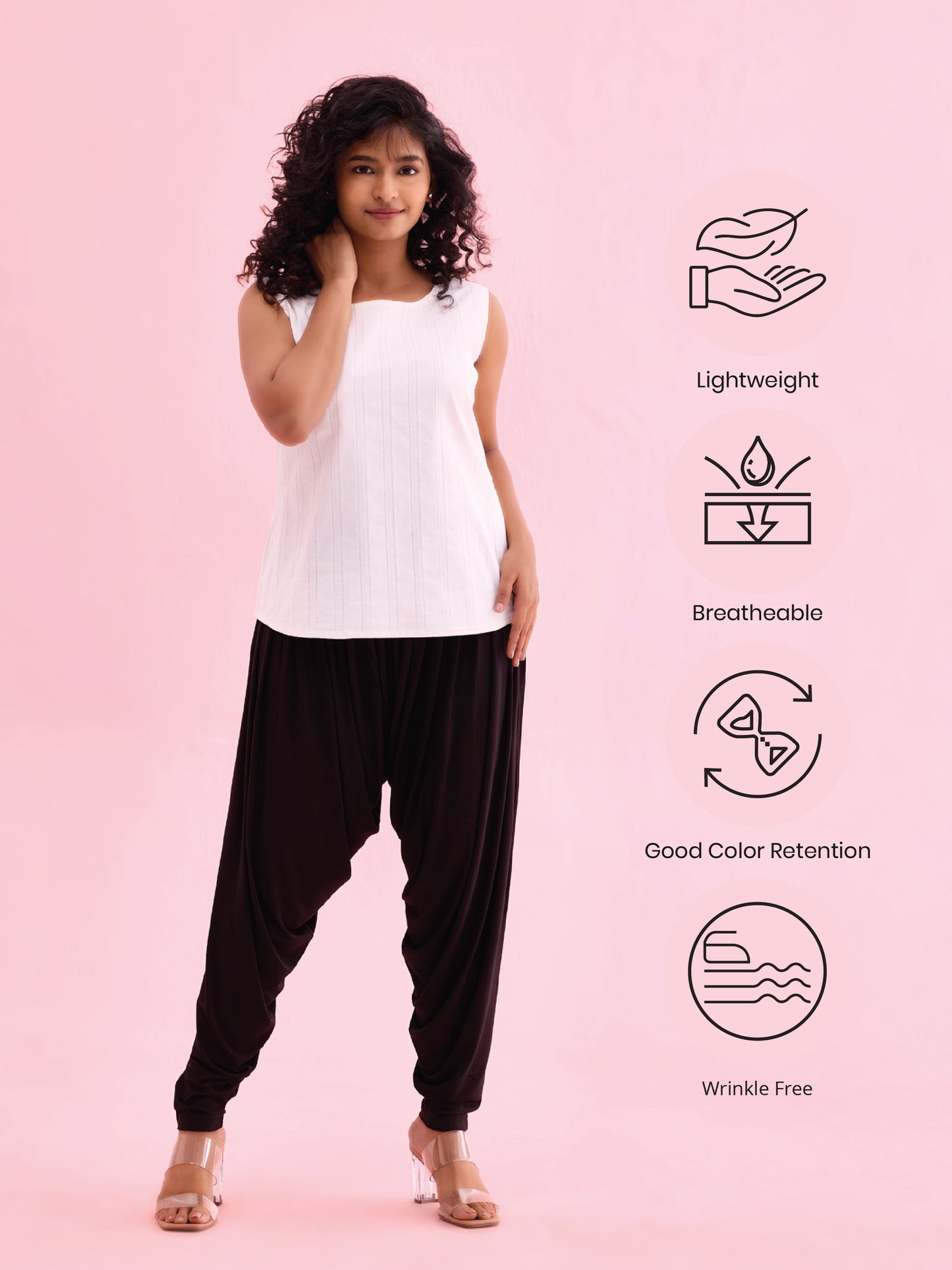 Pair a short kurta or a crop tee, our Solid Black Patiala is absolutely versalite product. Made from wrinkle free viscose & elastane, it has a elasticised waistband with front pleats that give a cowl look & cuffed hem.