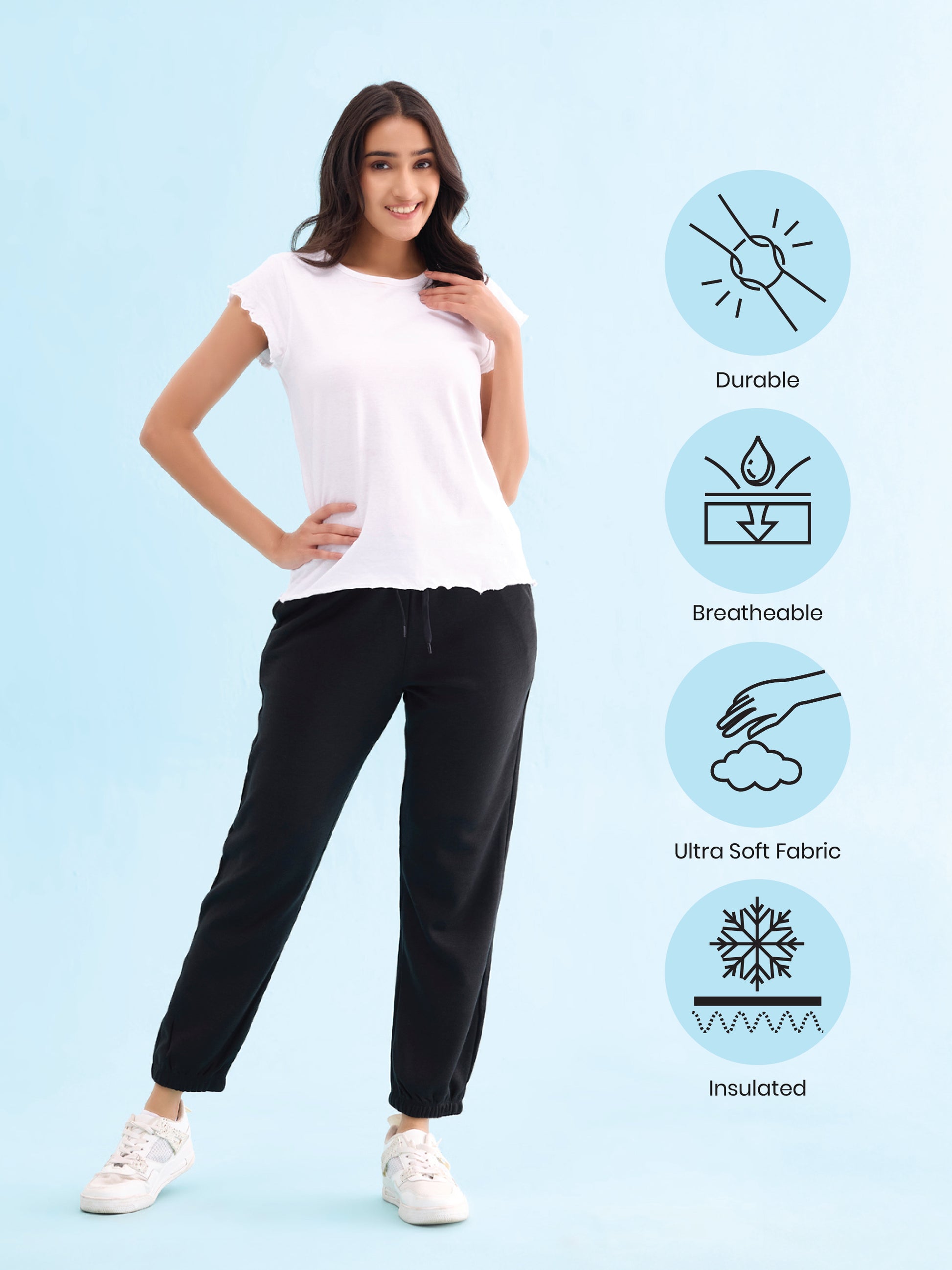 Stay warm this winter in the Solid Black Ultra Warm Joggers. Made from lyocell, Acrylic, Rayon & PU, this mid rise joggers comes with 2 pockets & elasticised waistband with drawstring & are perfect for cozying up this winters.