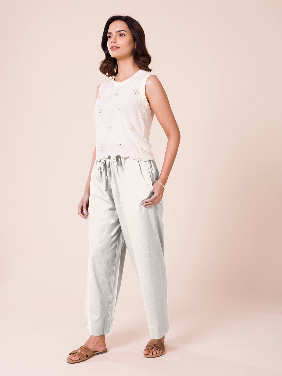 Be it a kurti or a top, these Cream Cotton Palazzos, with an elasticised waistband it fits the bill for every look. A pair of mid-rise cotton palazzos with an elasticised waistband, & a relaxed comfy fit.