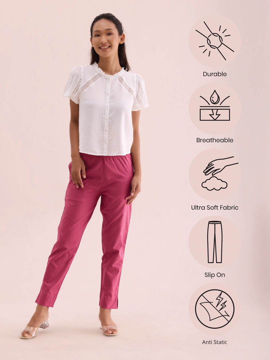 Go from board room to a brunch meeting in a snap with the Dark Pink Cotton Pencil Pants. Made from Cotton, it has a elasticised waistband with side pockets & a relaxed fit.