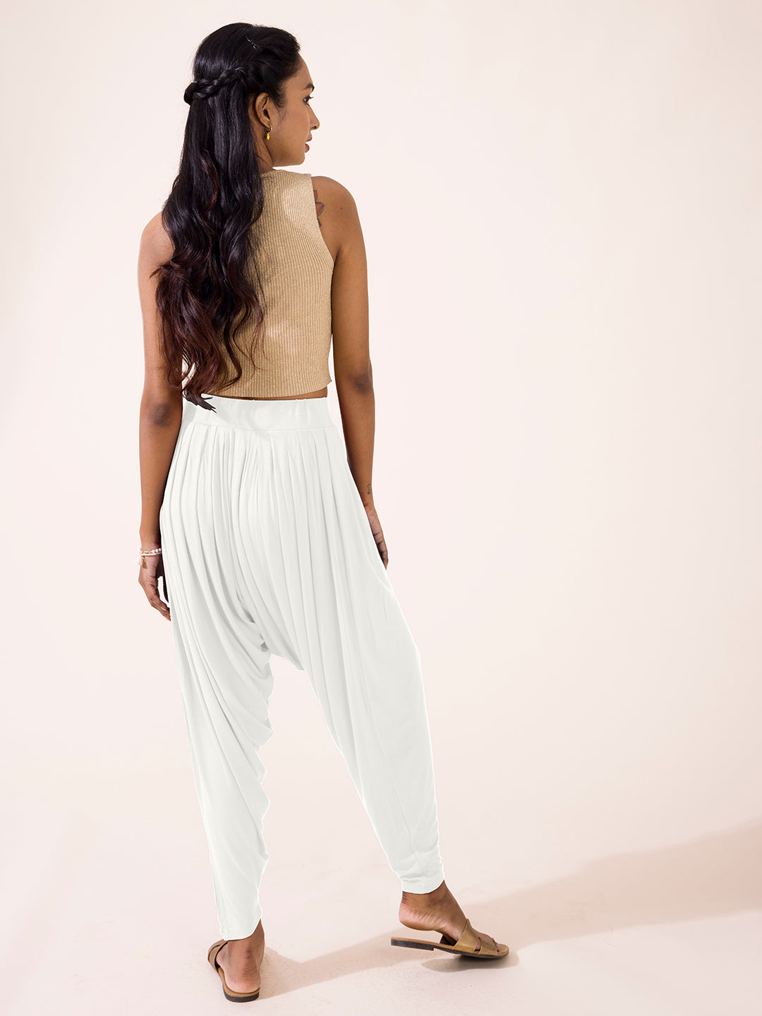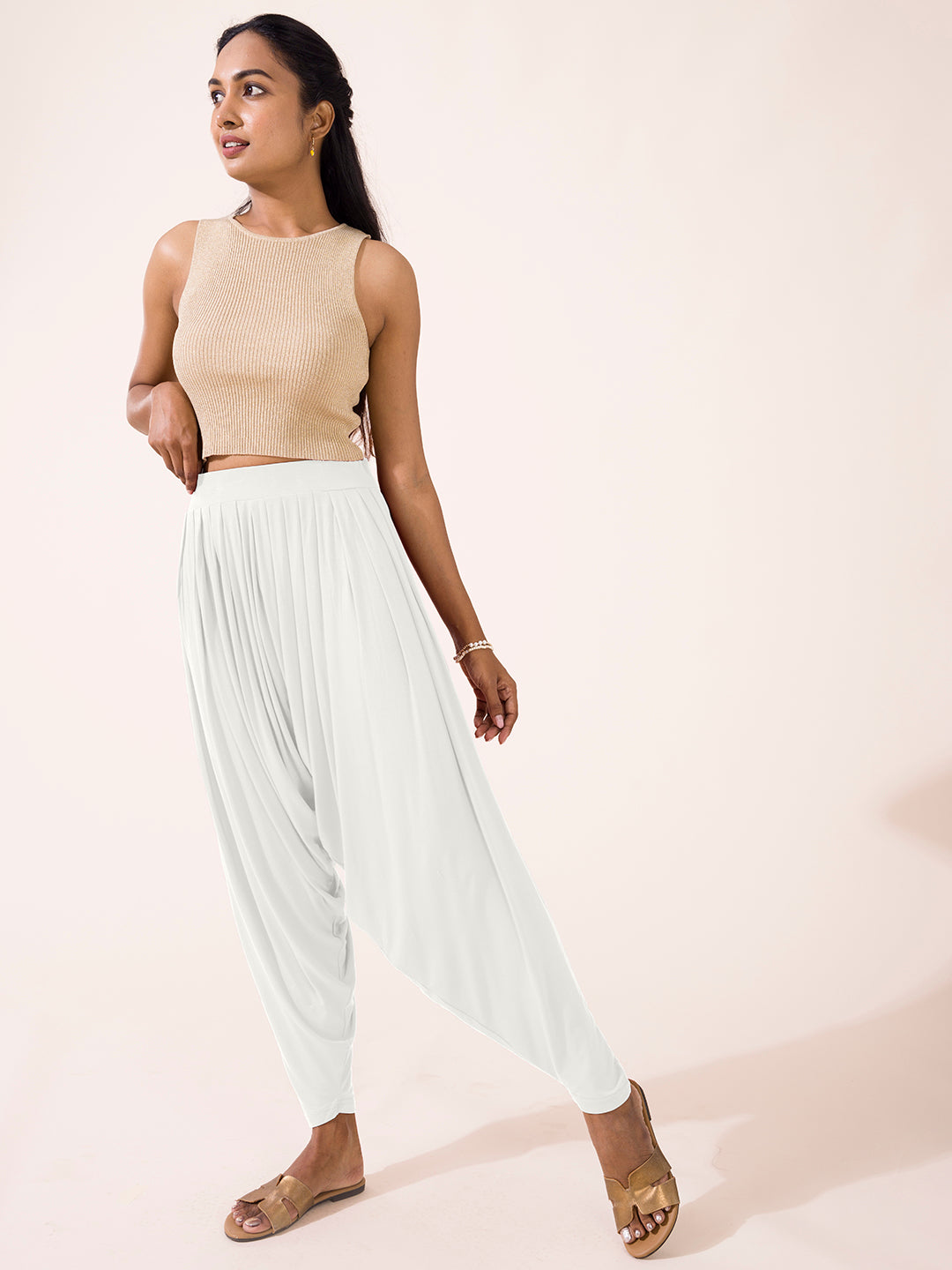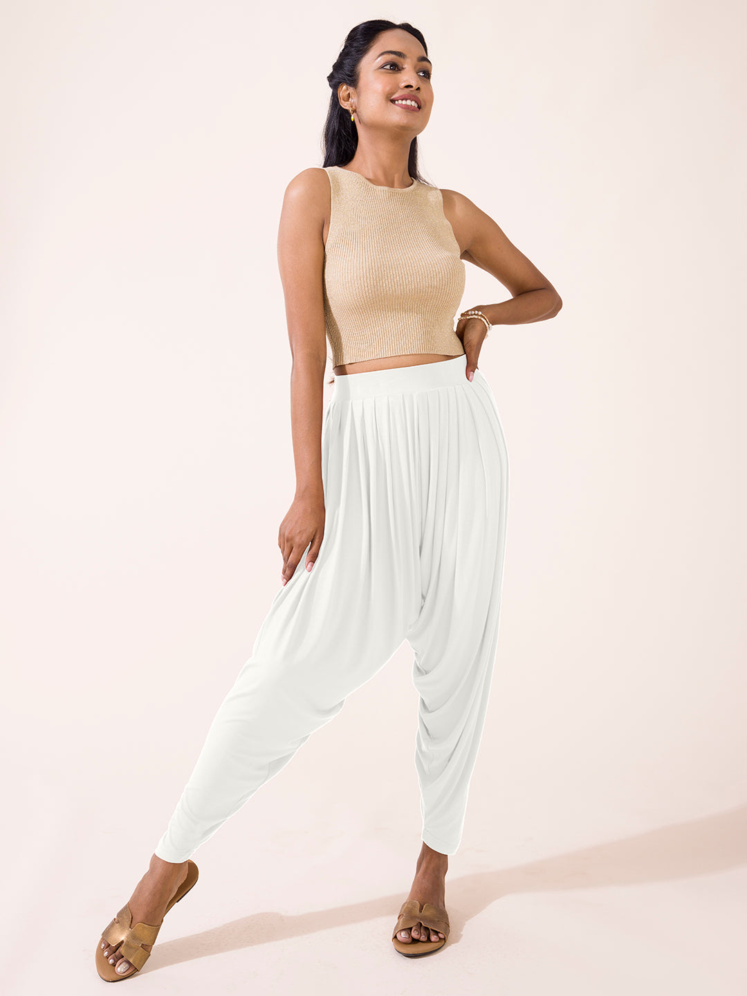 Pair a short kurta or a crop tee, our Solid Ecru Patiala is absolutely versalite product. Made from wrinkle free viscose & elastane, it has a elasticised waistband with front pleats that give a cowl look & cuffed hem.