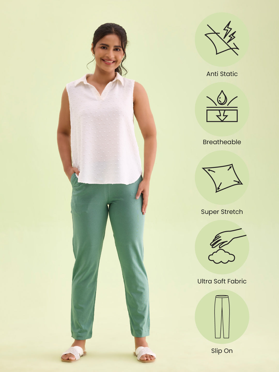 Amp up your style game for ethnic or western with our Solid Leaf Green Kurti Pants. Made from cotton & elastane, it is a mid-rise elasticised waistband pant with slant pocket & a tapered fit.
