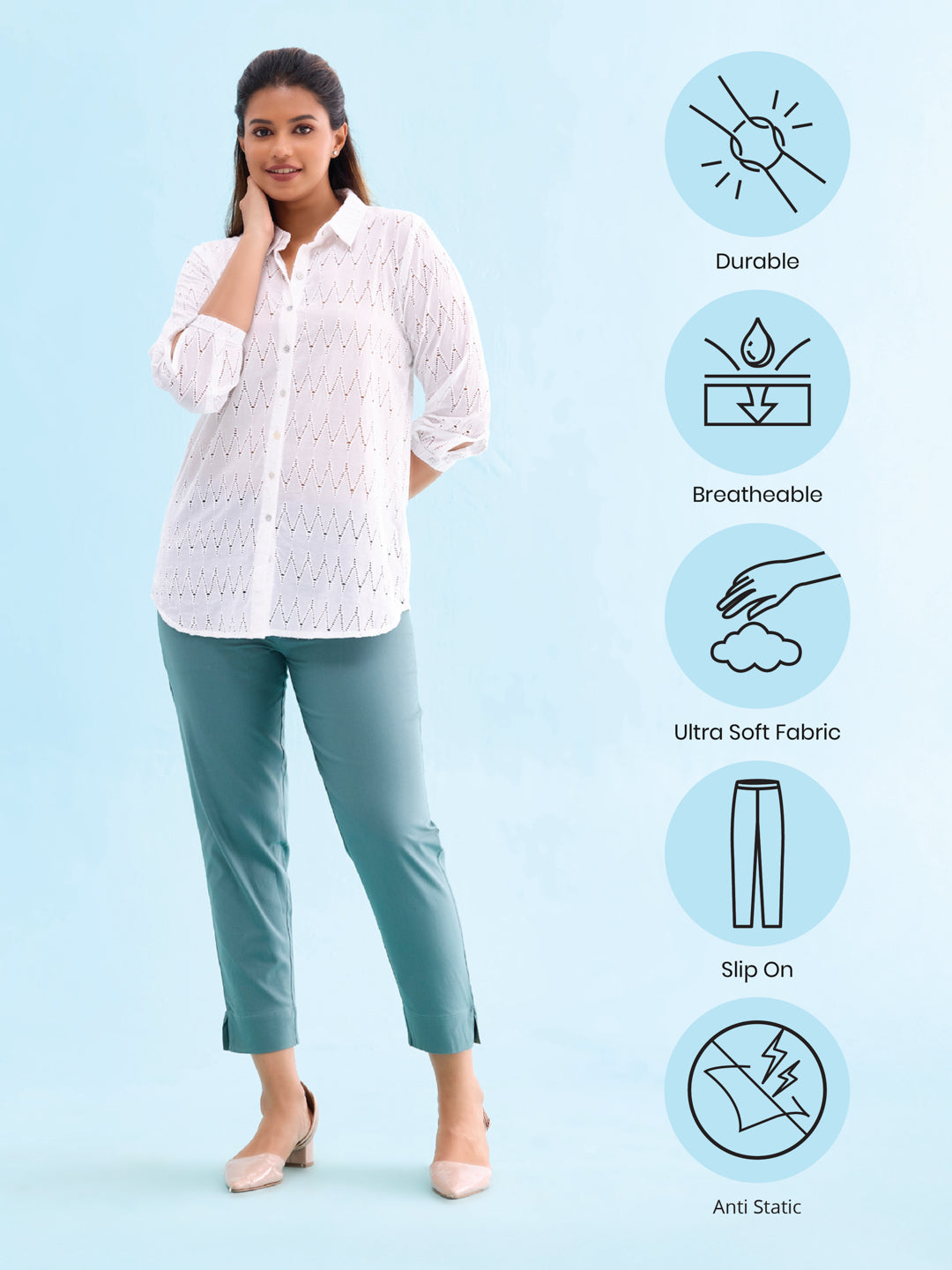 Go from board room to a brunch meeting in a snap with the Leaf Green Cotton Pencil Pants. Made from Cotton, it has a elasticised waistband with side pockets & a relaxed fit.