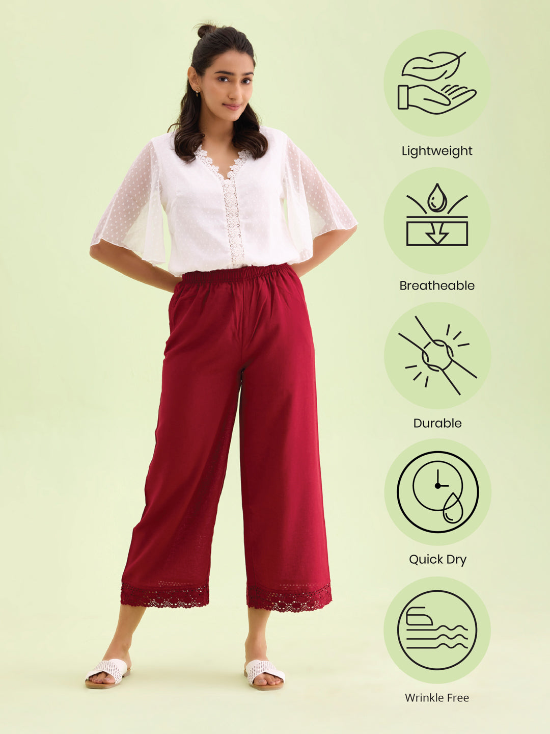 Be it a kurti or a top, these Light Maroon Linen Wide Pant comes with an elasticised waistband it fits the bill for every look. Made from Linen & Viscose, it has side pocket & relaxed fit with slip on closure.