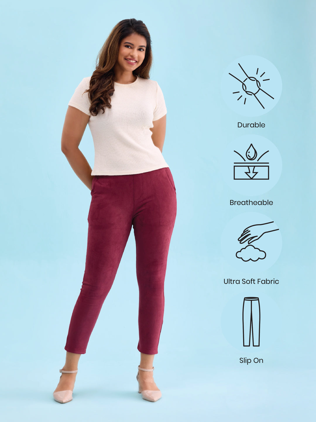 Stay warm this winter in the Solid Maroon Mid Rise Suede Treggings. Made from polyester & elastane, this mid rise slip on trousers with elasticised waistband & slim fit are perfect for board meetings or night out in the town.