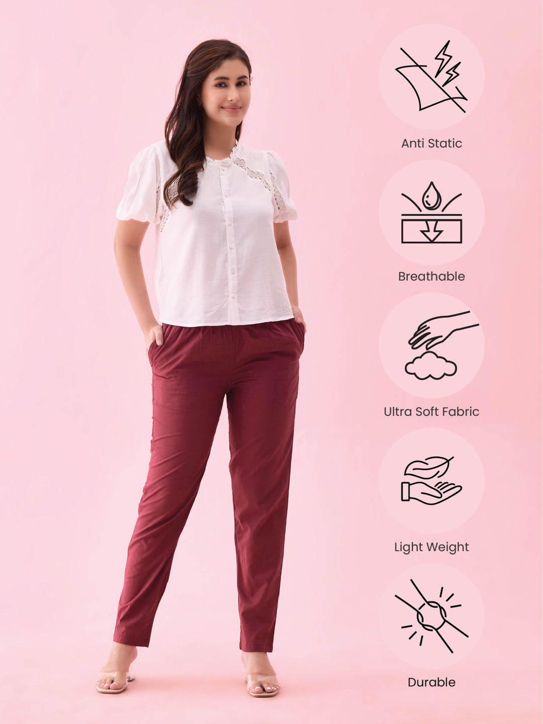 Go from casual to street smart look in a jiffy with the Solid Marron Cotton Pants. Made from cotton, it has a elasticised waistband with drawstring closure, slant pockets, mid rise & a tapered fit.