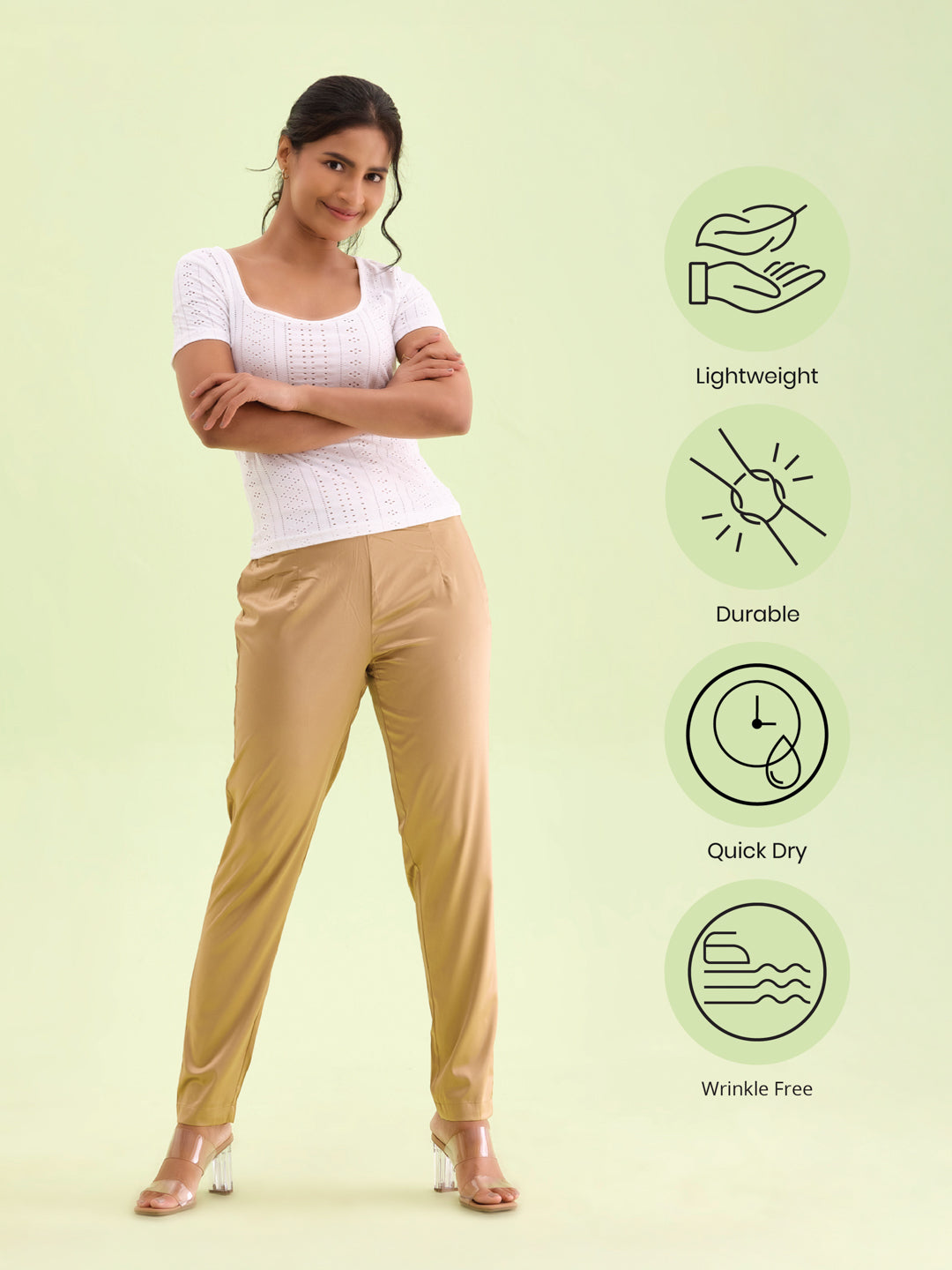 Be it any occasion, the Solid Medium Gold Shiny Pants can elevate any look of yours. Made polyester & spandex, it has a elasticised waistband with a concealed zipper & slim fit.