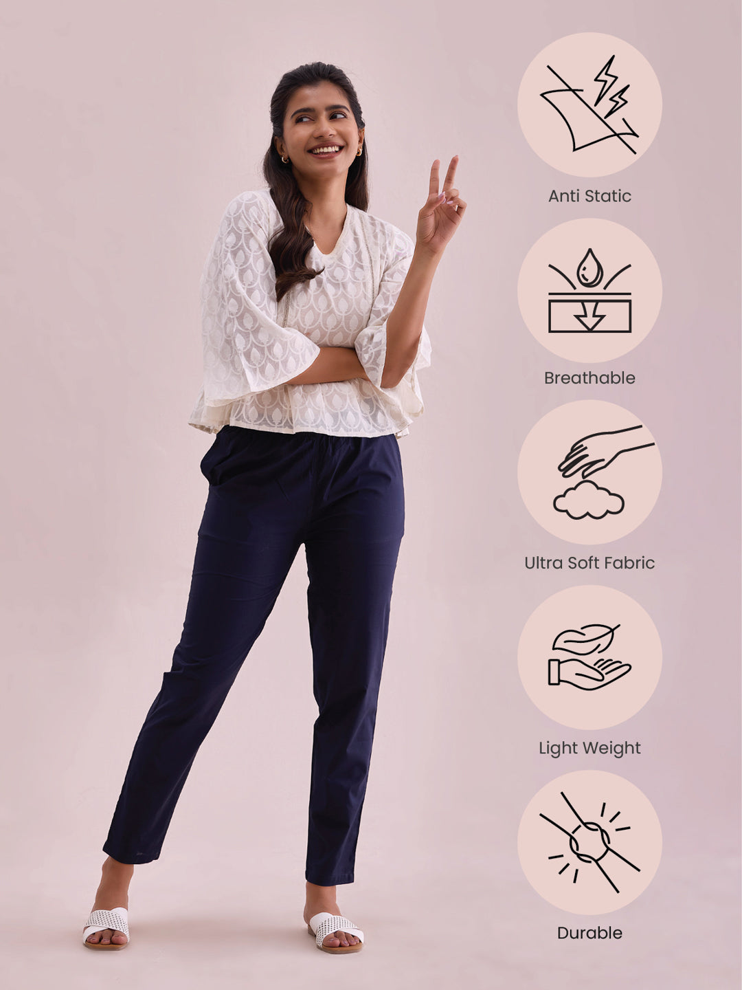 Go from casual to street smart look in a jiffy with the Solid Navy Cotton Pants. Made from cotton, it has a elasticised waistband with drawstring closure, slant pockets, mid rise & a tapered fit.