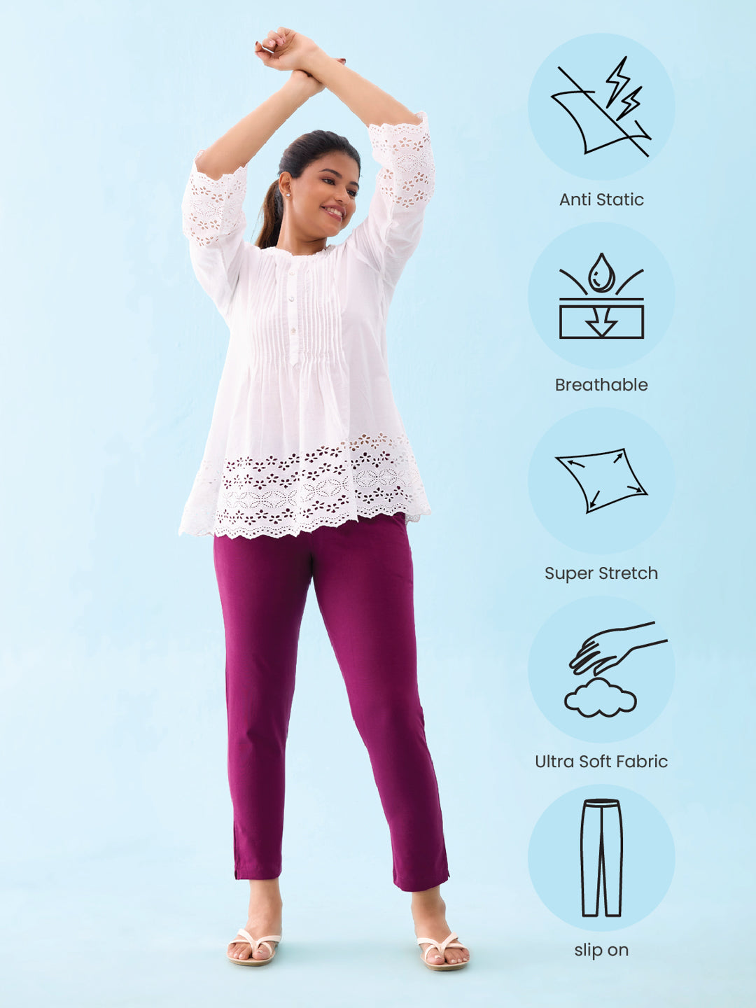 Amp up your style game for ethnic or western with our Solid Plum Kurti Pants. Made from cotton & elastane, it is a mid-rise elasticised waistband pant with slant pocket & a tapered fit.
