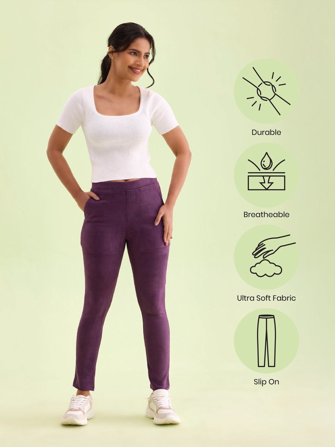 Stay warm this winter in the Solid Purple Mid Rise Suede Treggings. Made from polyester & elastane, this mid rise slip on trousers with elasticised waistband & slim fit are perfect for board meetings or night out in the town.