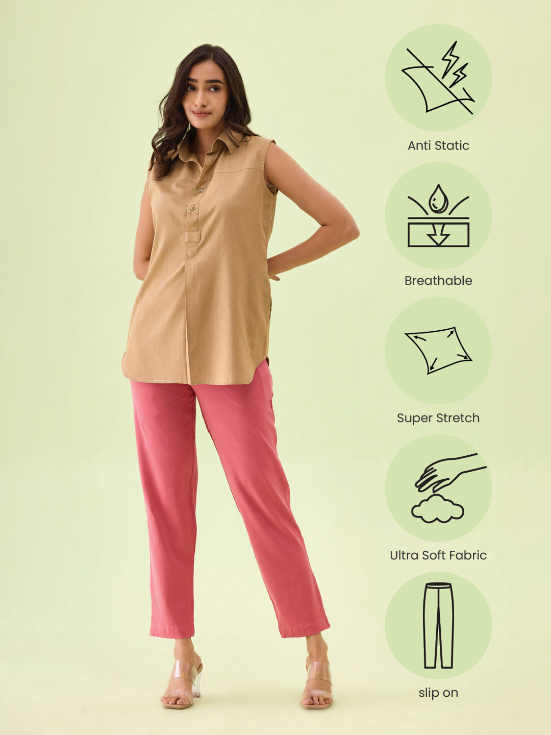 Amp up your style game for ethnic or western with our Solid Rusty Pink Kurti Pants. Made from cotton & elastane, it is a mid-rise elasticised waistband pant with slant pocket & a tapered fit.