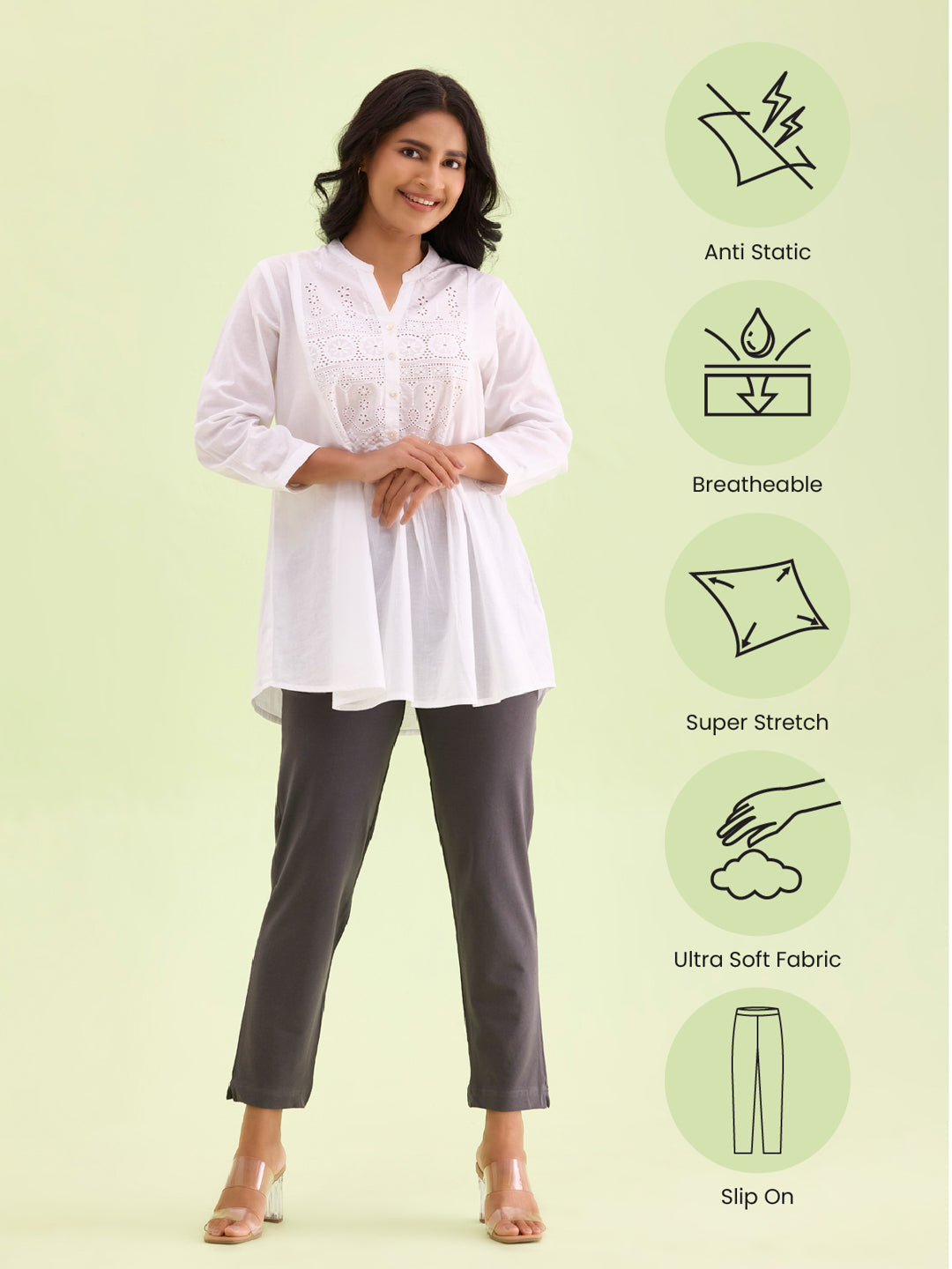 Amp up your style game for ethnic or western with our Solid Silver Grey Kurti Pants. Made from cotton & elastane, it is a mid-rise elasticised waistband pant with slant pocket & a tapered fit.