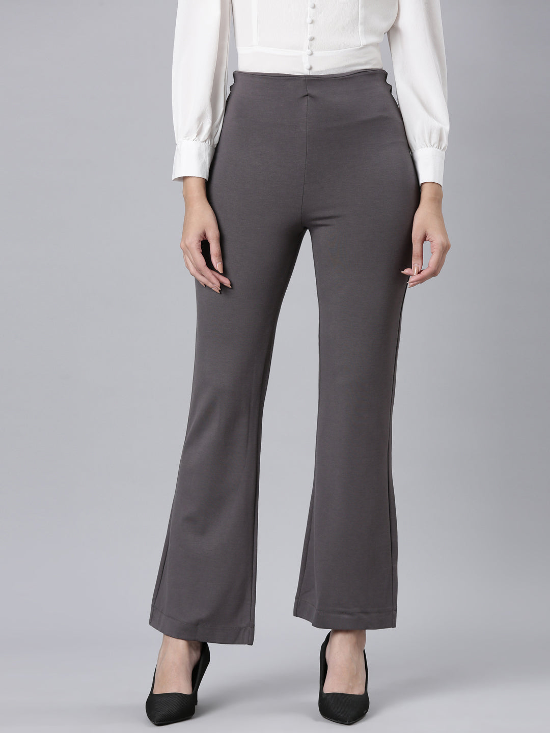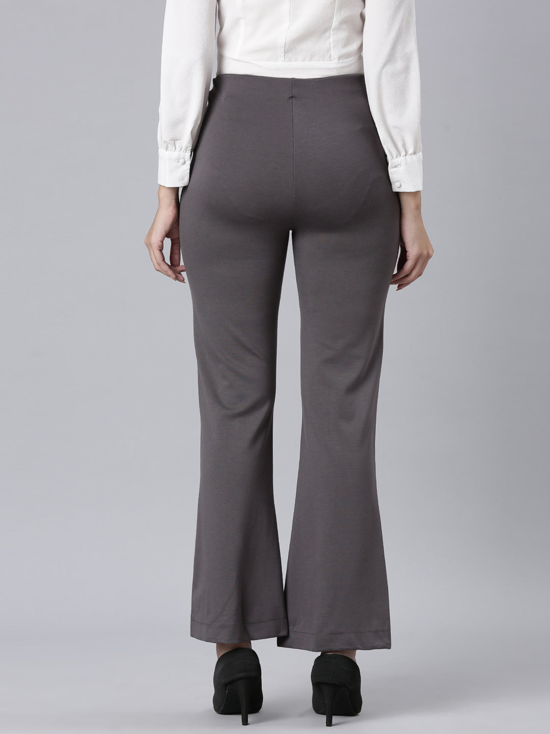 The Solid Silver Grey Ponte Bell Bottoms of flared pants bring a vintage-inspired charm to any outfit in no time. Made from Ponte, It has a elasticated waistband with high rise waist and flare fit.