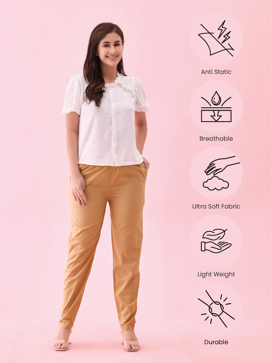 Go from casual to street smart look in a jiffy with the Solid Wheat Cotton Pants. Made from cotton, it has a elasticised waistband with drawstring closure, slant pockets, mid rise & a tapered fit.