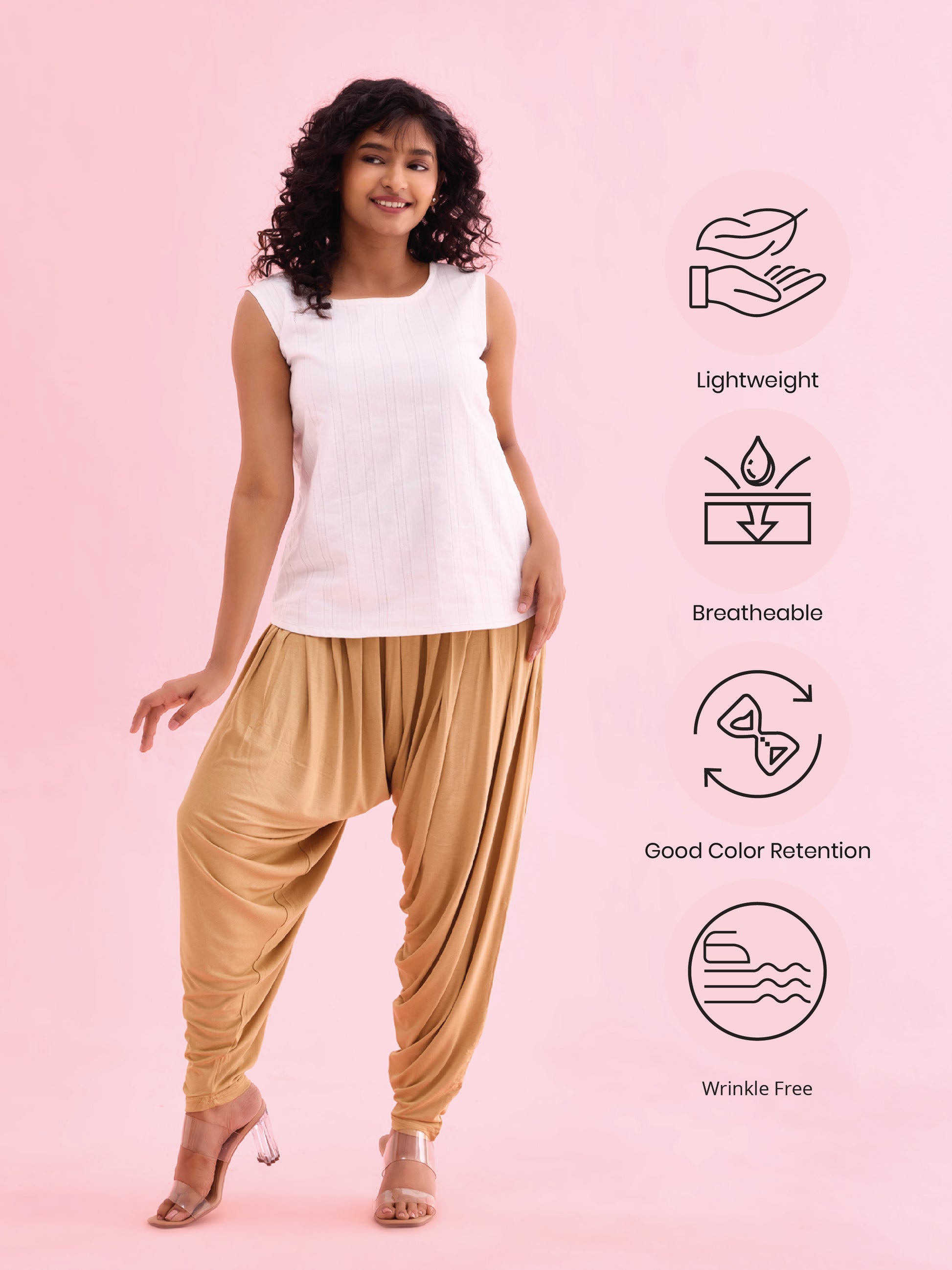 Pair a short kurta or a crop tee, our Solid Wheat Patiala is absolutely versalite product. Made from wrinkle free viscose & elastane, it has a elasticised waistband with front pleats that give a cowl look & cuffed hem.