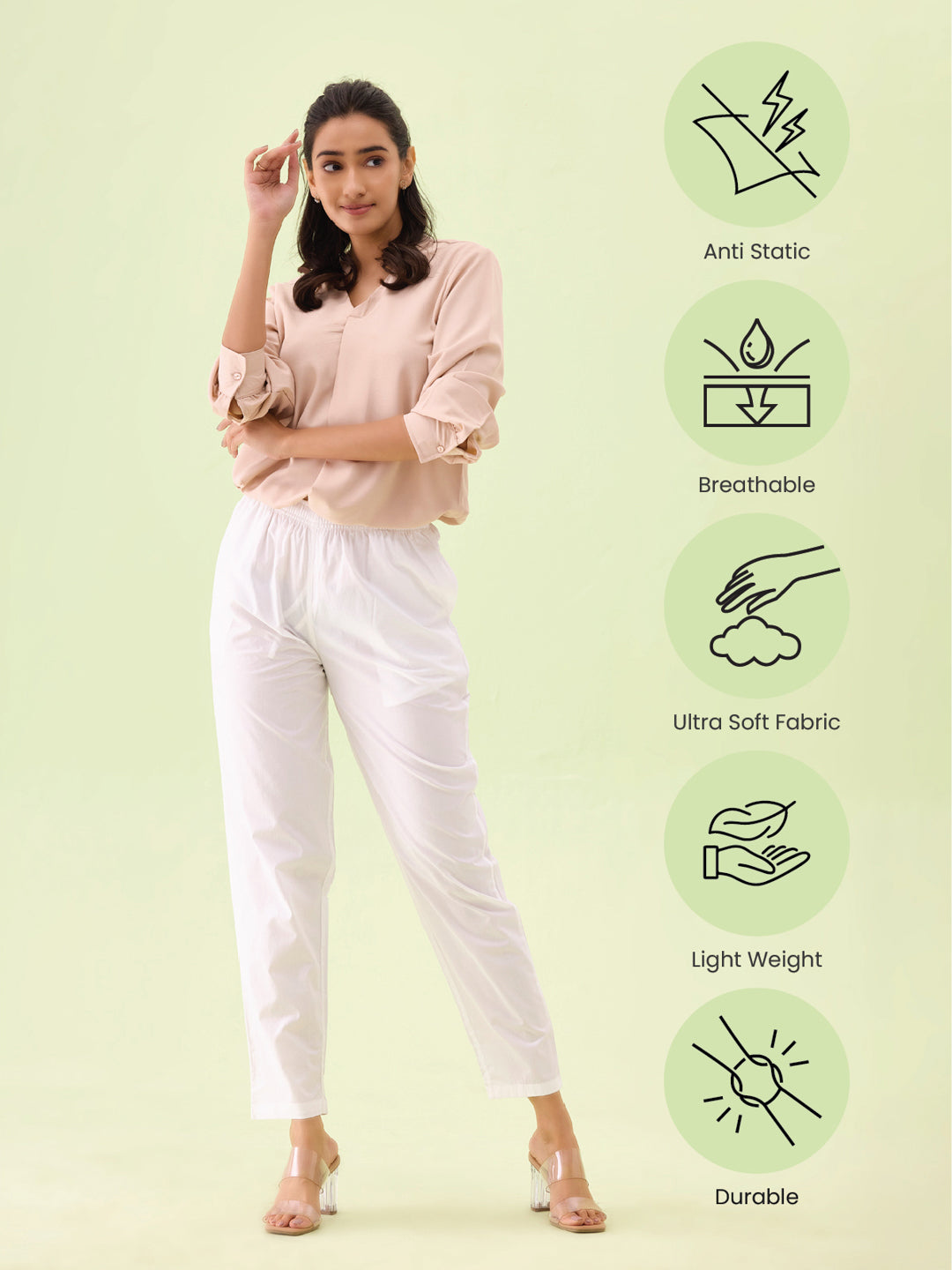 Go from casual to street smart look in a jiffy with the Solid White Cotton Pants. Made from cotton, it has a elasticised waistband with drawstring closure, slant pockets, mid rise & a tapered fit.