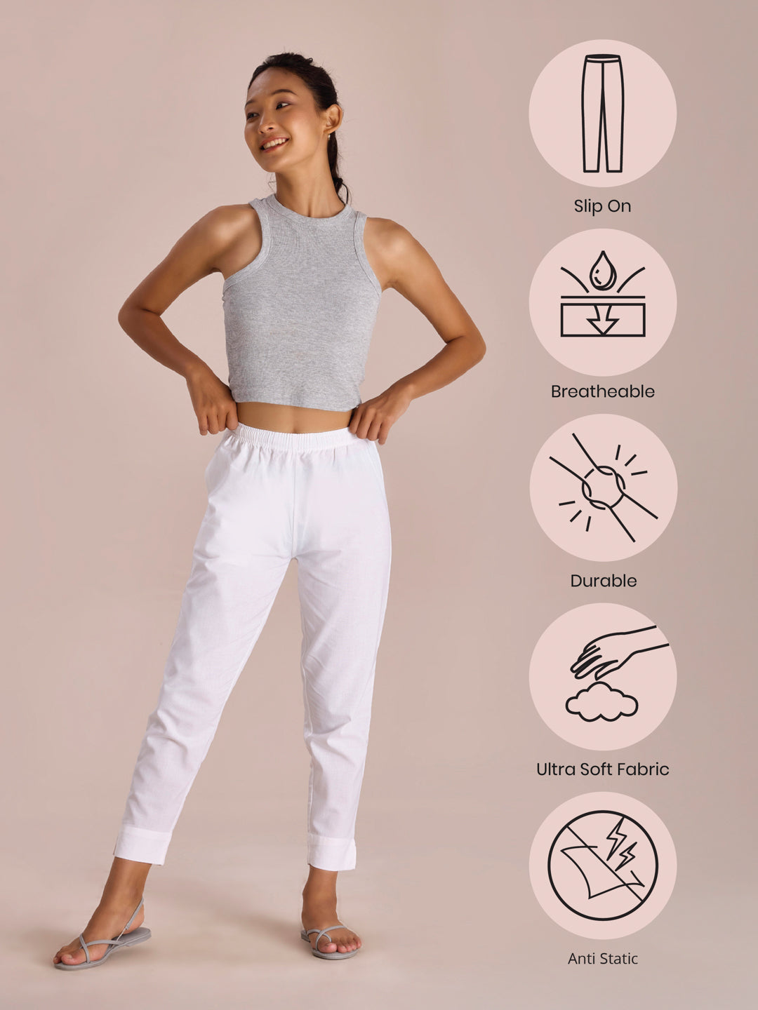 Go from board room to a brunch meeting in a snap with the White Cotton Pencil Pants. Made from Cotton, it has a elasticised waistband with side pockets & a relaxed fit.